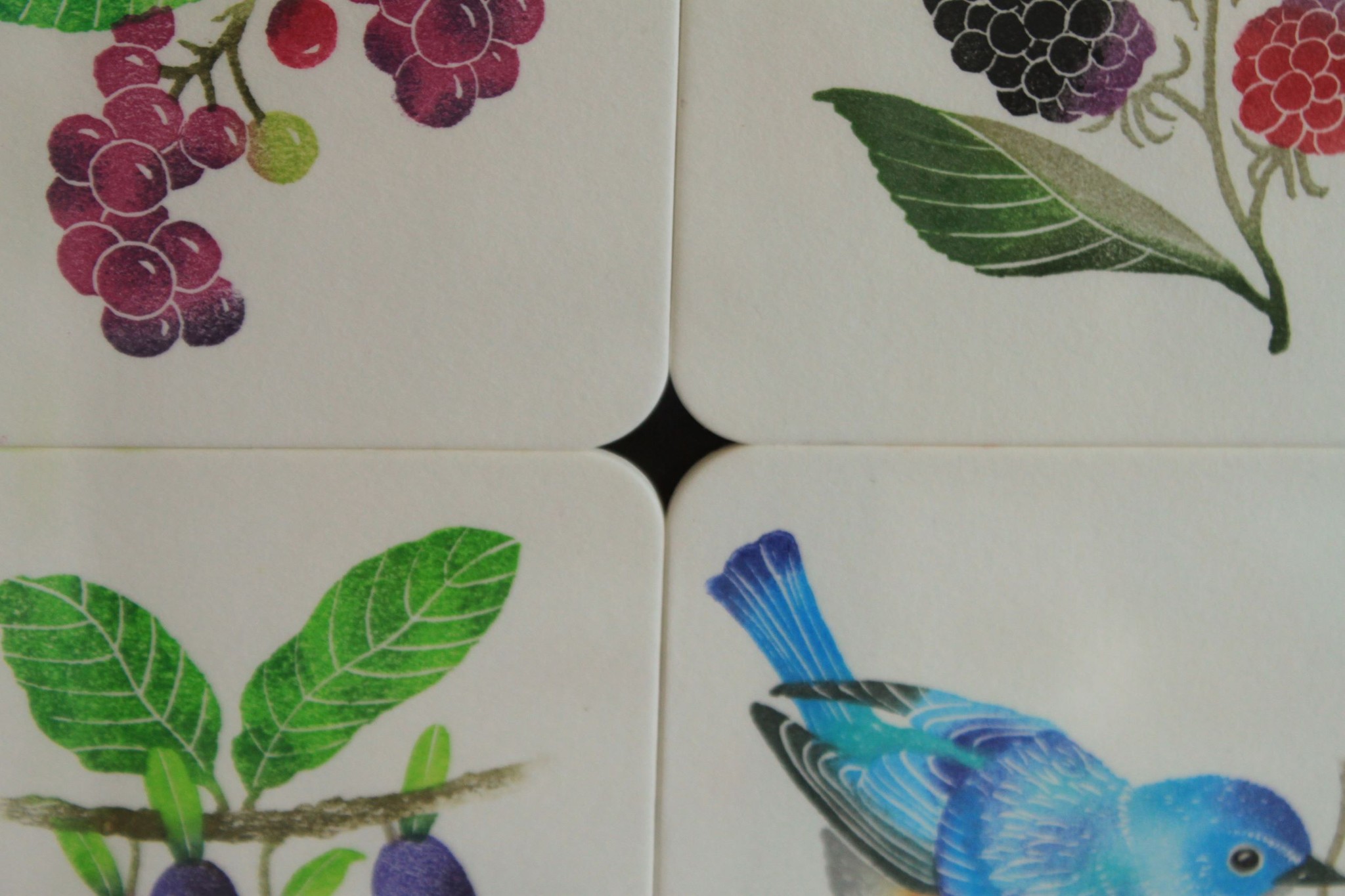 大倉さんの作品には、コースターを台紙に使ったものも多くあります。あの、コップの下に敷くコースターです。