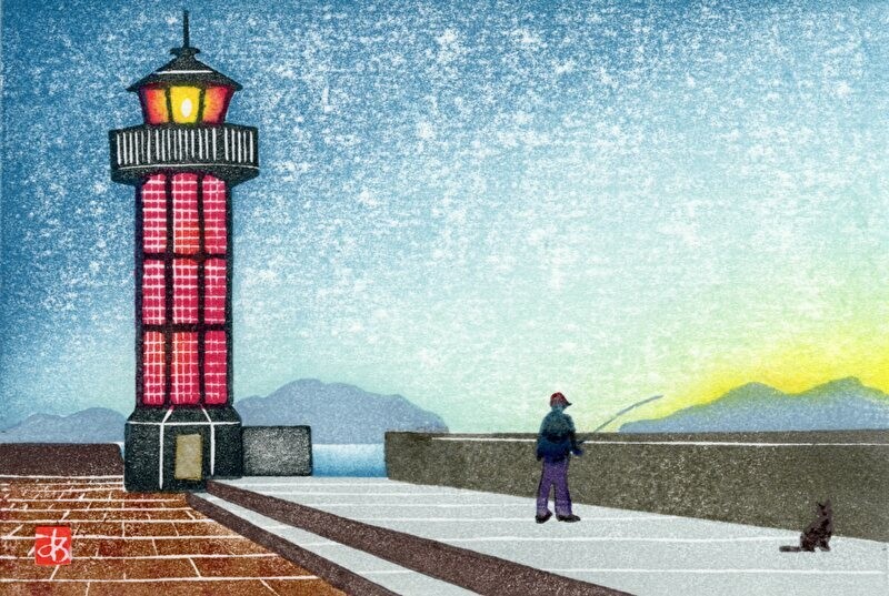 こちらの作品は、高松市を訪れたことがある方は「あっ」と思うことでしょう。高松港のシンボルともなっている、ガラスで出来た赤灯台のある風景です。