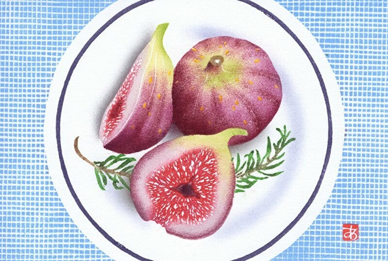 オシャレなランチョンマットの上に豆皿にのったイチジク、ローズマリーを添えて。この作品は第26回日本はがき芸術作家展大賞を受賞しました。