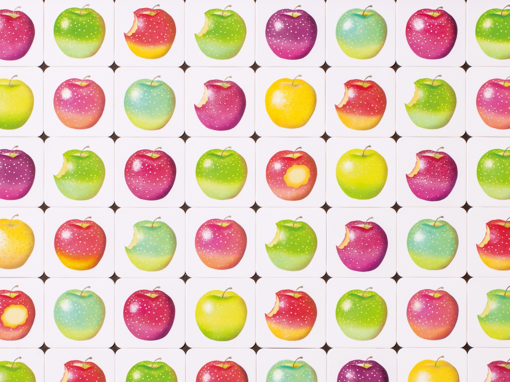 呼吸を整えてからぱっと持ち上げると、鮮やかなリンゴがくっきりと。リンゴのへたの部分は「別のパーツ」でぽんっと押します。