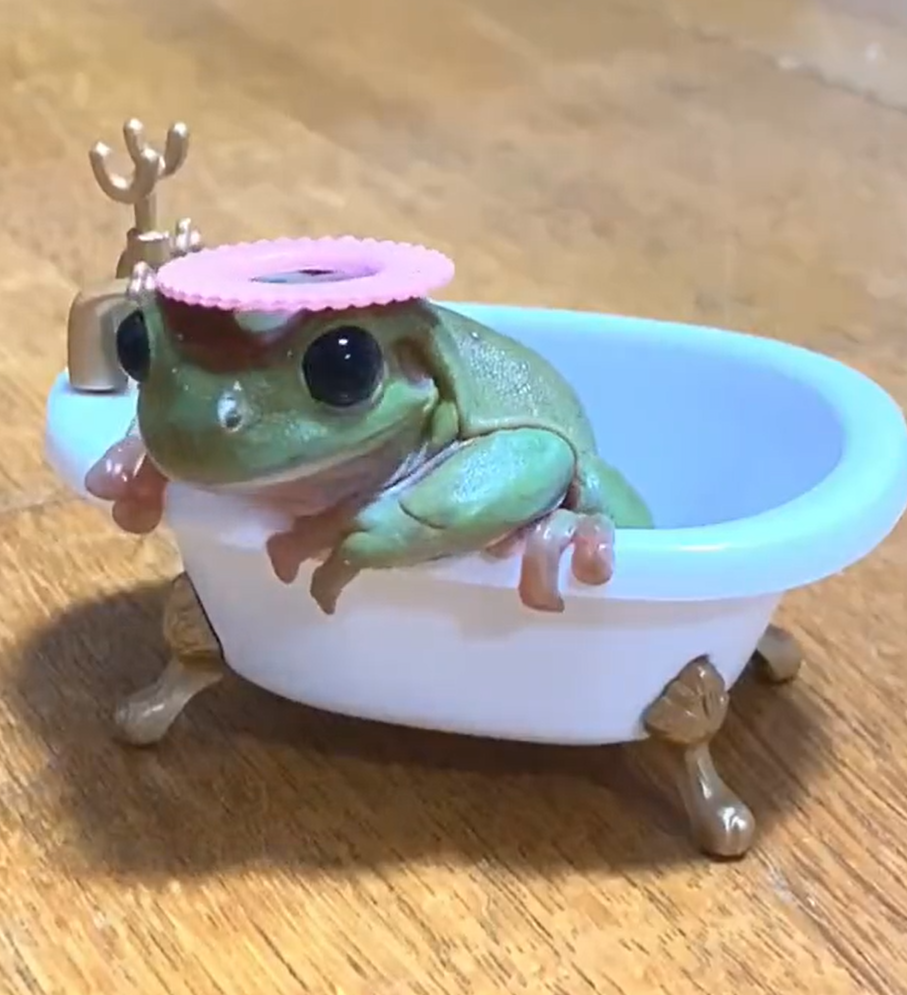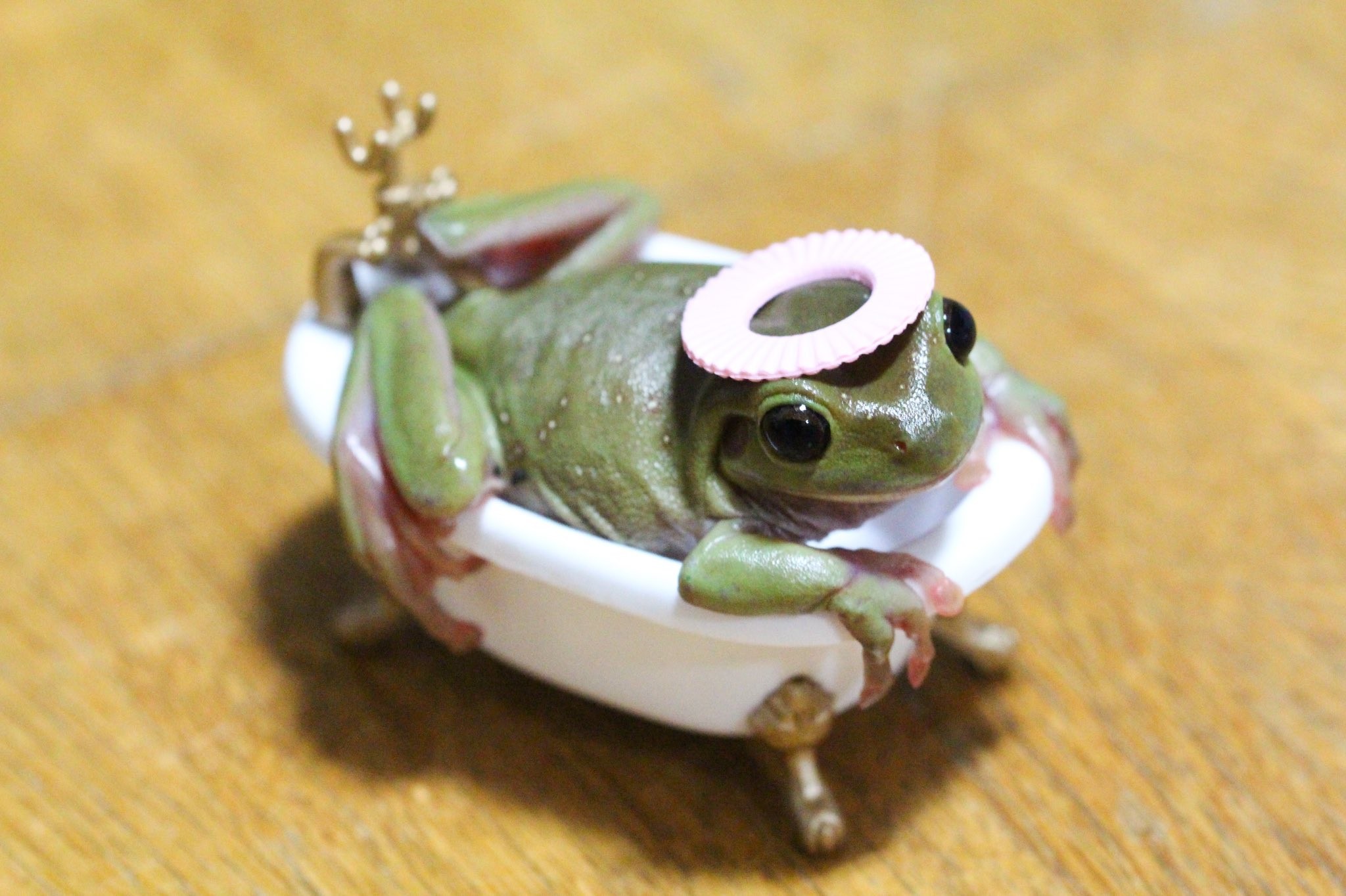 カエルがシャンプーハットをつけて、ミニチュアサイズのバスタブの中でくつろいでいます。このままゆっくりくつろぐのかと思いきや、素早くシャンプーハットを取って、放り投げてしまいました。この突然の出来事を撮影した動画に、Twitterで21.2万件以上のいいねがつくなど、話題になっています。