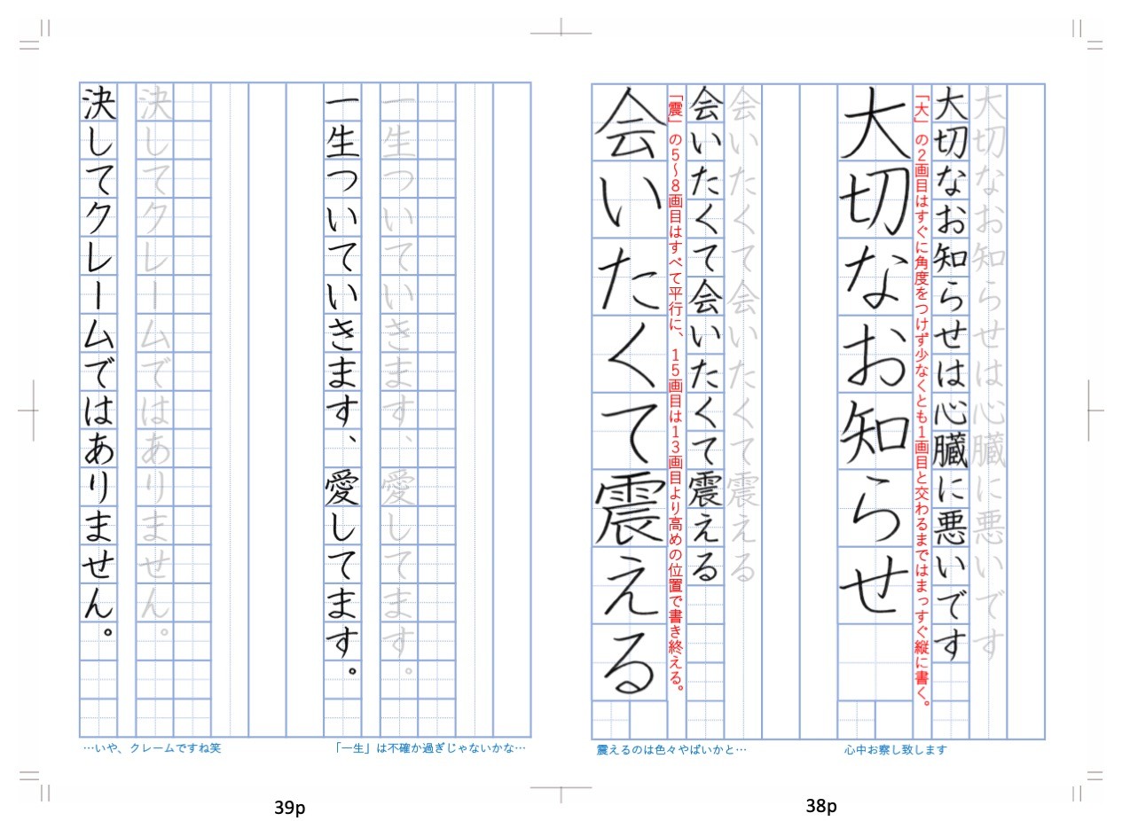 ファンレターでよく使うフレーズの書き取り練習ができるほか、各フレーズの下には、YURAサマのコメントも書かれています。練習帳を通じて、手紙をよりよくするためのコツを伝授しようとしています。