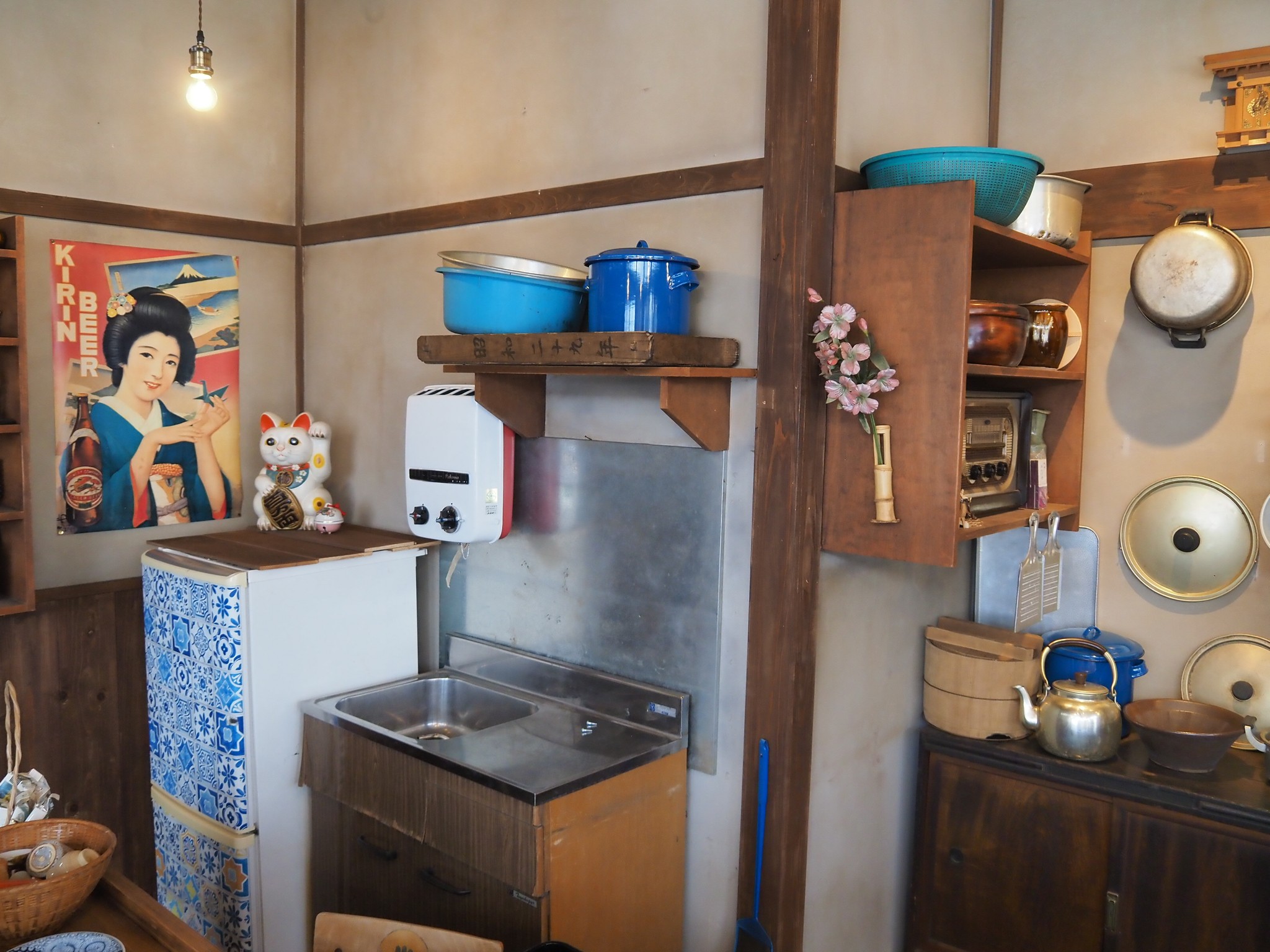 カウンターや壁は映画のセットですが、食器や調理器具などの小道具は、地域の人から譲り受けた古いものを使い、できる限り映画セットの雰囲気を表現しました。