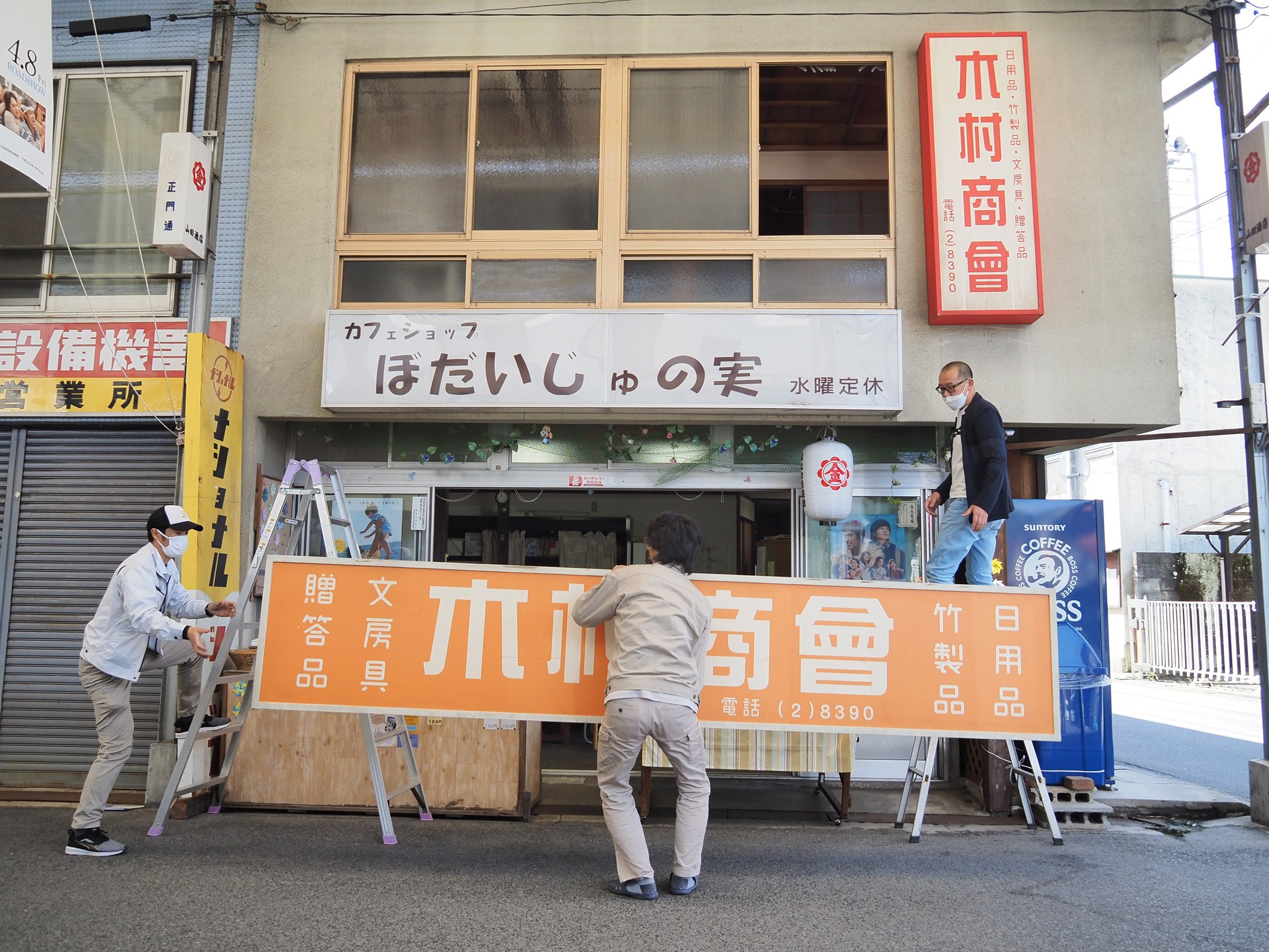 浅口市観光協会とともに街並みの再現に取り組むのは、大谷地区元気いっぱいまちづくり協議会。持ち主から許可を得た建物に映画セットの看板を運び、取り付けていきます。