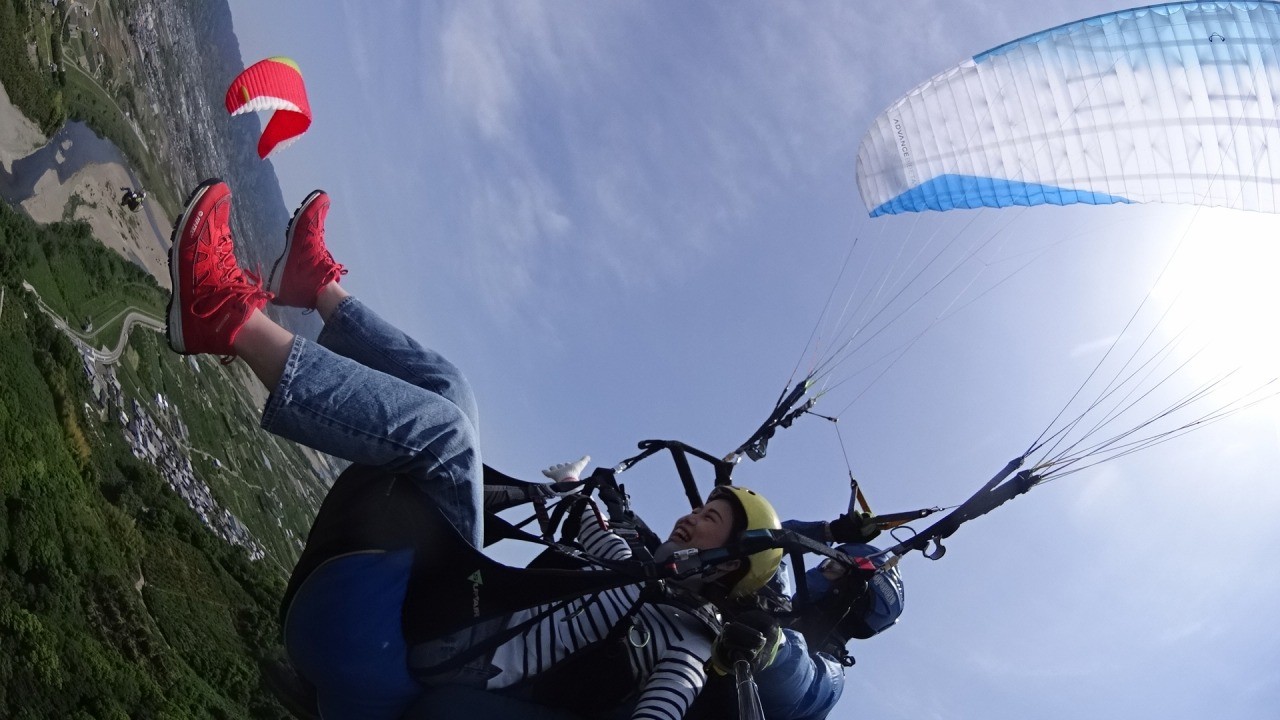パラグライダーを体験する場合、後ろには熟練のインストラクターが付き、2人で飛び立ちます。特に初めての場合、近くに経験者がいる場合は先に飛んでもらい、障害物のない崖のような場所から飛び出していく姿を見ながら「どのように動けばいいのか」をチェックします。