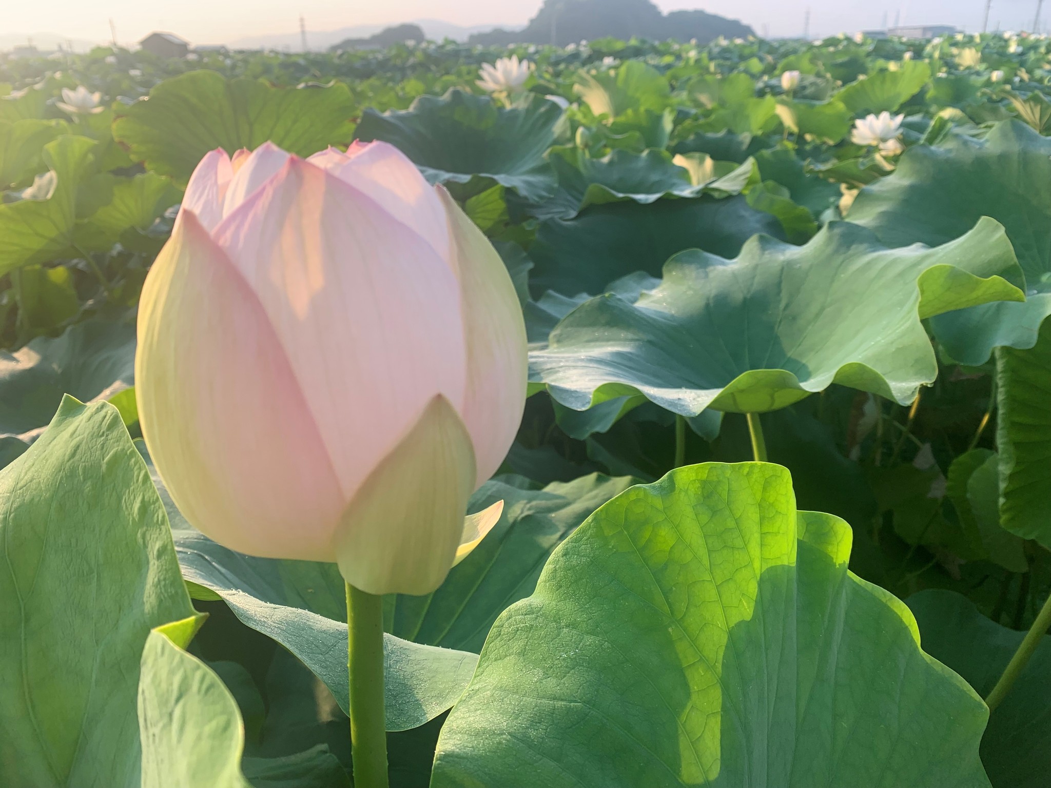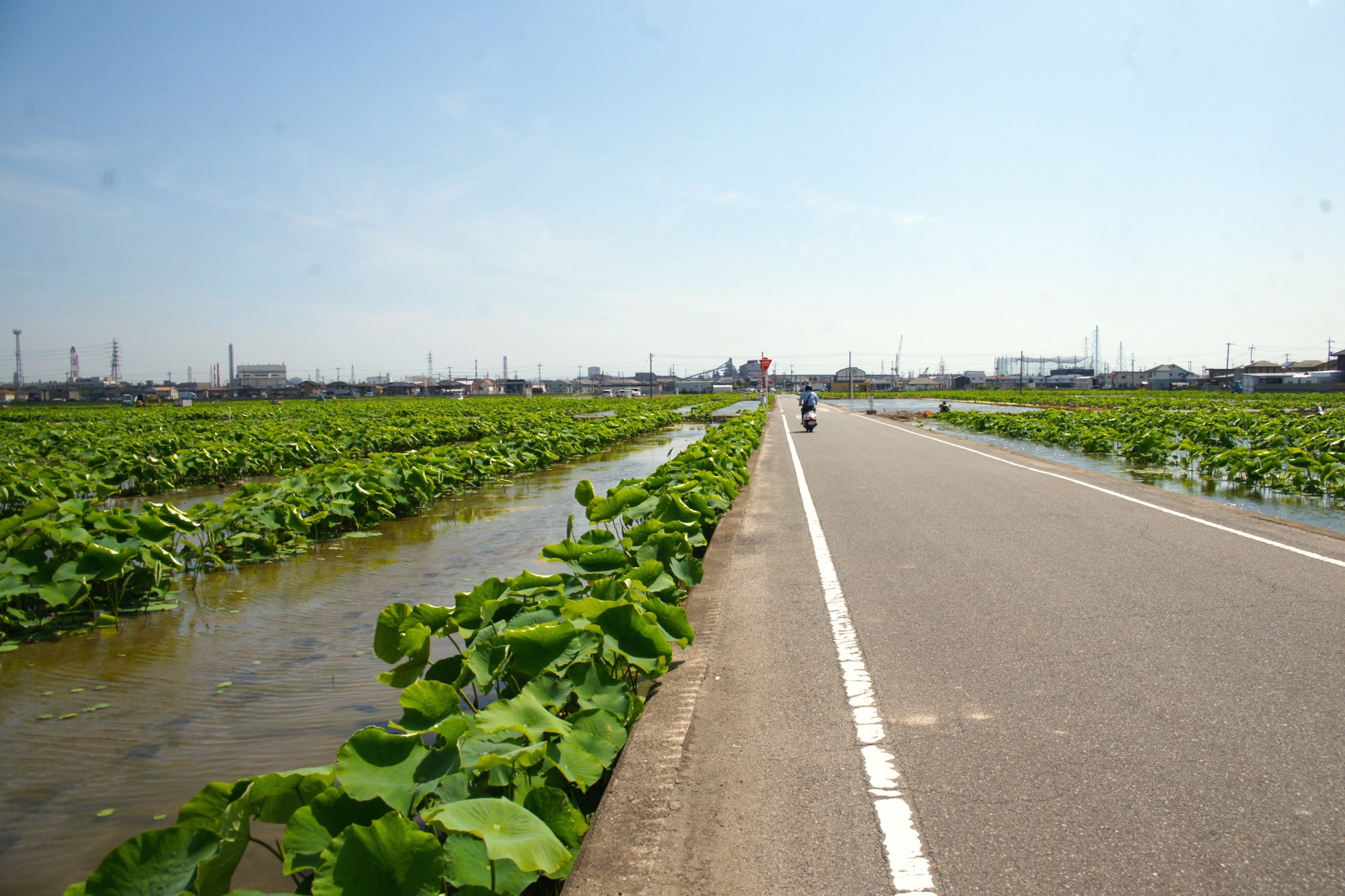 この日は、藤井さんが顧問を務める倉敷市の連島(つらじま)レンコン農家「浜田農産」を訪問しました。レンコンは3月から6月にかけて作付けのシーズン。のびのびと育ち始めたレンコンの葉が風に揺れていました。レンコンはこれから成長段階に応じて夏レンコン、さらに主力商品の冬レンコンとして出荷予定です。