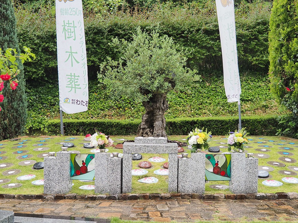 花を眺めながらゆったりと歩きたくなるこのイギリス風の庭園は、わたるが手掛ける「GARDEN’S(ガーデンズ)倉敷」というガーデニング霊園です。テーブルセットをしつらえた墓、孫の手形をデザインした墓など、個性的なデザイン墓や永代供養塔が並びます。植物とともに永眠するバラの樹木葬、オリーブの樹木葬も注目されています。