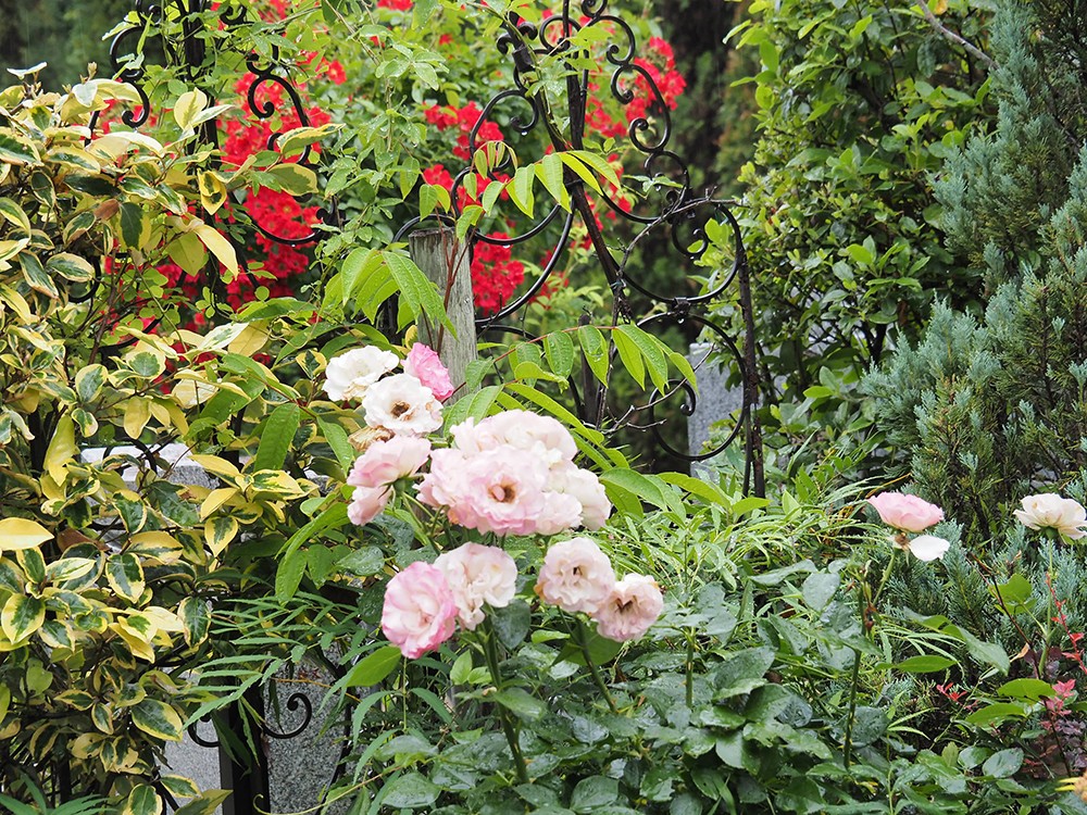 レンガの小径を進むと、四季折々の花が出迎えてくれる庭。訪れた6月上旬には、色とりどりのバラが咲き誇っていました。