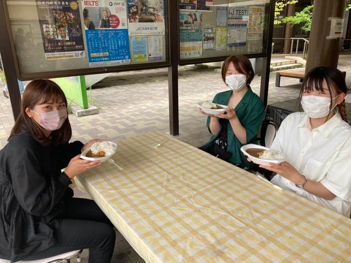 学生の反応は上々。「ありがたいです。一人暮らしなので、おばあちゃんが野菜を送ってくれたりするのですが、やはり無料は嬉しい」と話す1年生男子。1年生の女子3人組も、テーブルでカレーを囲んで「超美味しかった」「物価も上がっているし、本当に助かります」と笑顔だった。