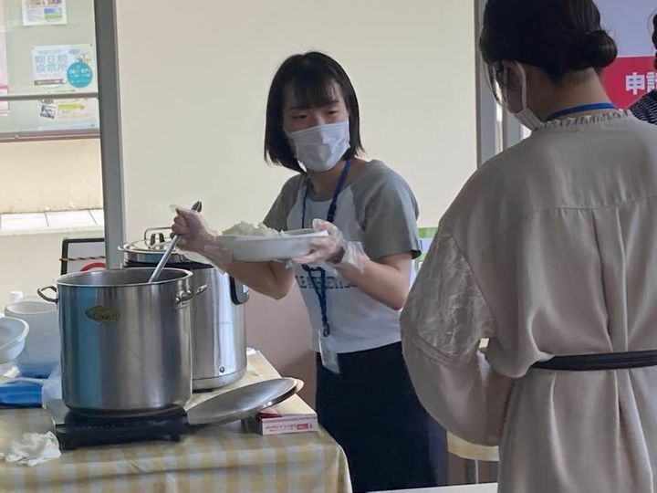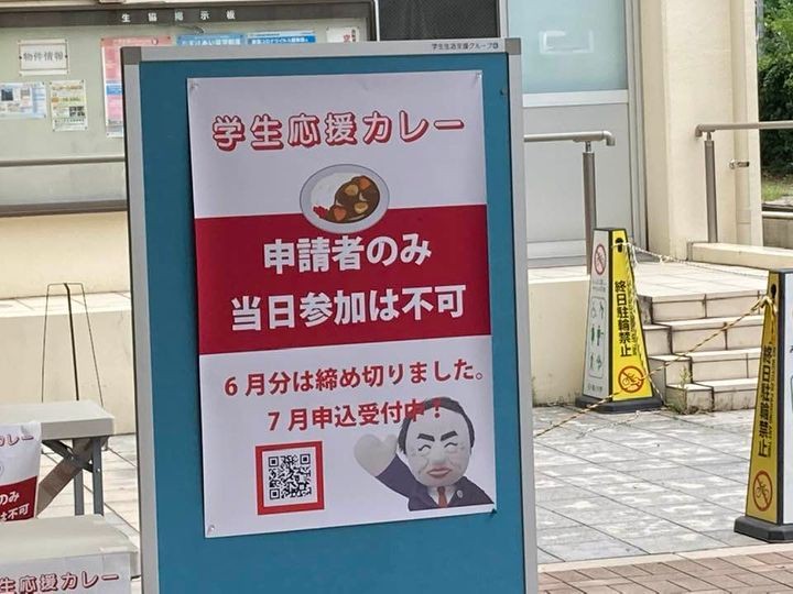 7月6日正午過ぎ、学生会館外のオープンスペースに学生が集まり始めた。「学生応援カレー」と大きく書いた看板と受付の机が準備され、大学職員らがスタンバイ。「サイズは?」と聞きながらカレーをよそう男性が、この支援活動を企画した成重伸昭さんだ。職員歴20年以上という学生生活支援課長である。