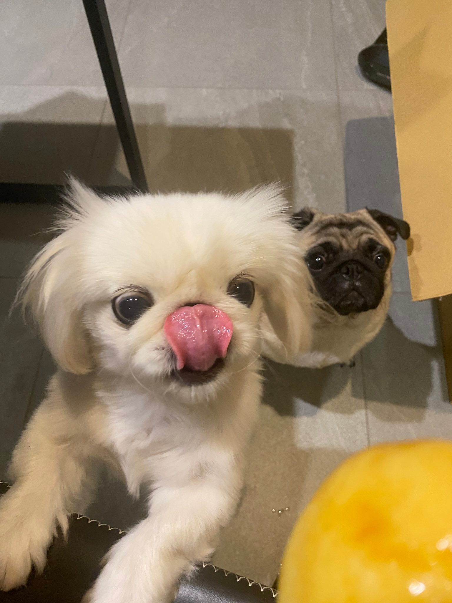 犬が2匹いる家は、2匹の関係性を見るのも楽しみの一つです。大好きな白桃を食べられると思ったら、隣の犬に食べられそうになり、「えぇ!?そっち!?」というパグの表情がまるで人間のように見える写真がツイートされています。コメントでは、「いぬ!!?」「めっちゃ立ってる」「貫禄が違うな」などと表情もさることながら、2本足でしっかりと立っているのがすごいと盛り上がっています。飼い主のよこむすび(@yokomu_subi)さんに話を聞きました。