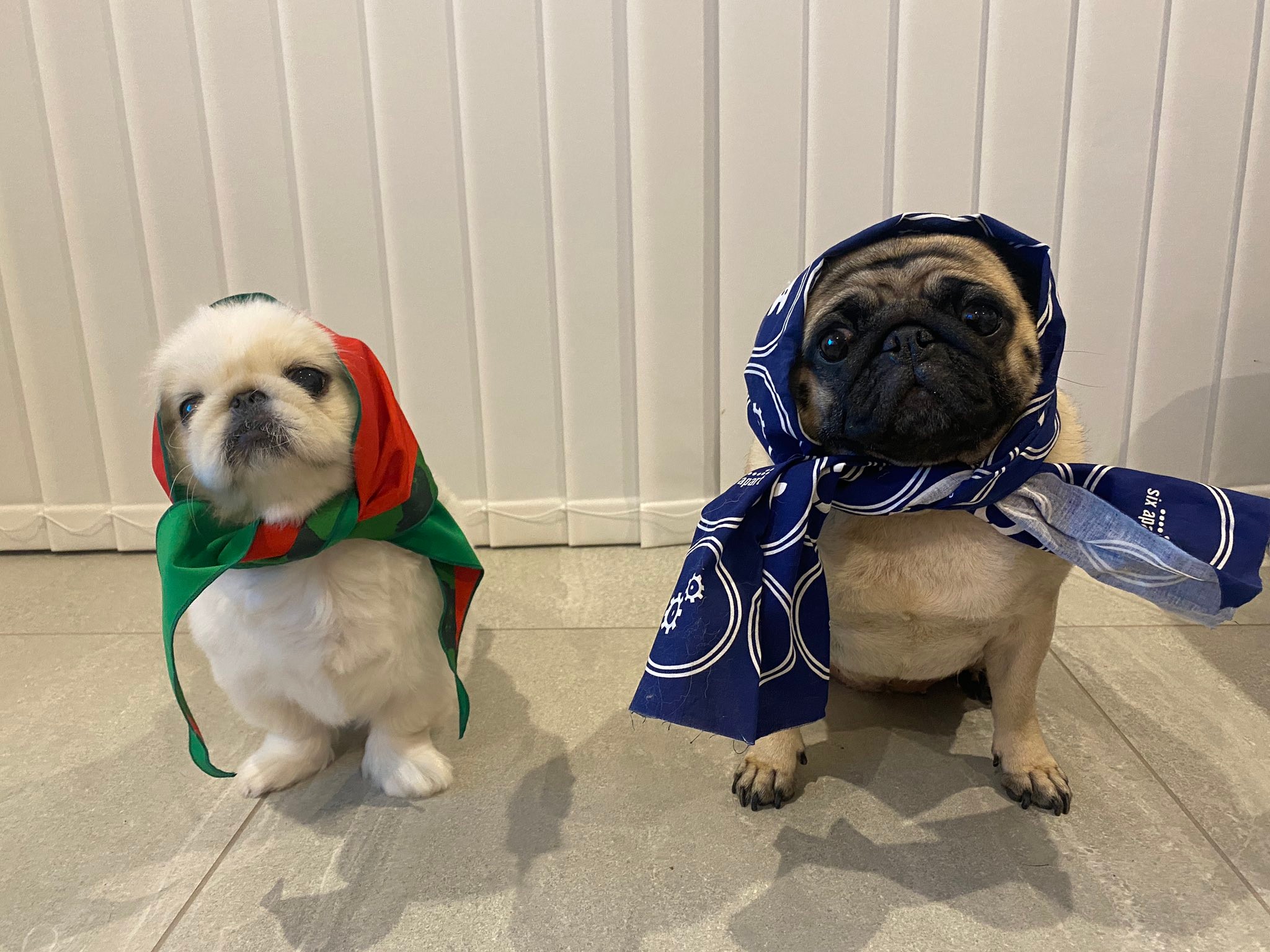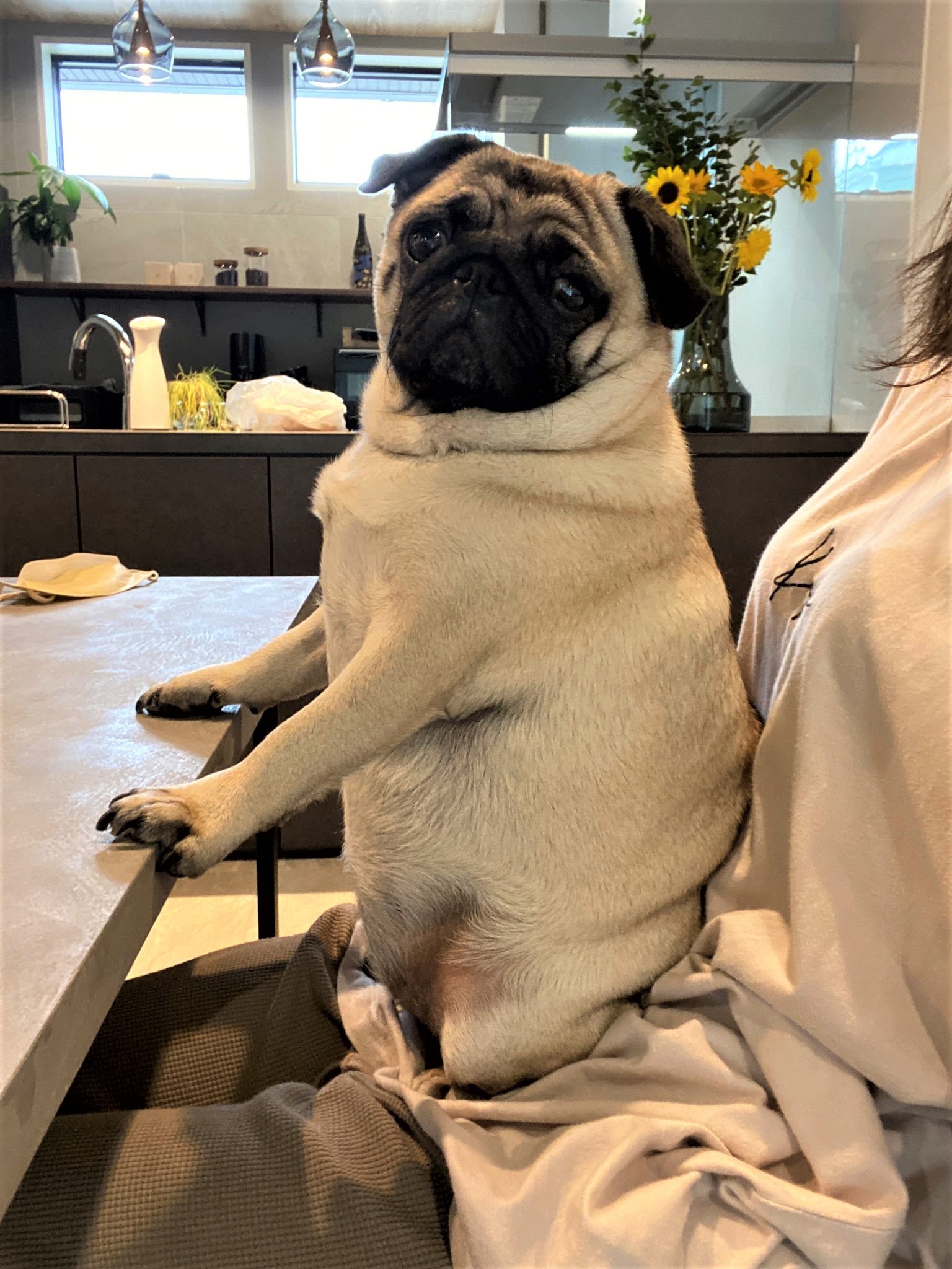 この写真の犬はパグの横綱ちゃん4歳です。隣にいるのはペキニーズの小結ちゃん3歳です。2匹とも3か月の時に、飼い主さんの元にやってきました。