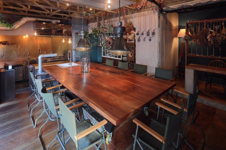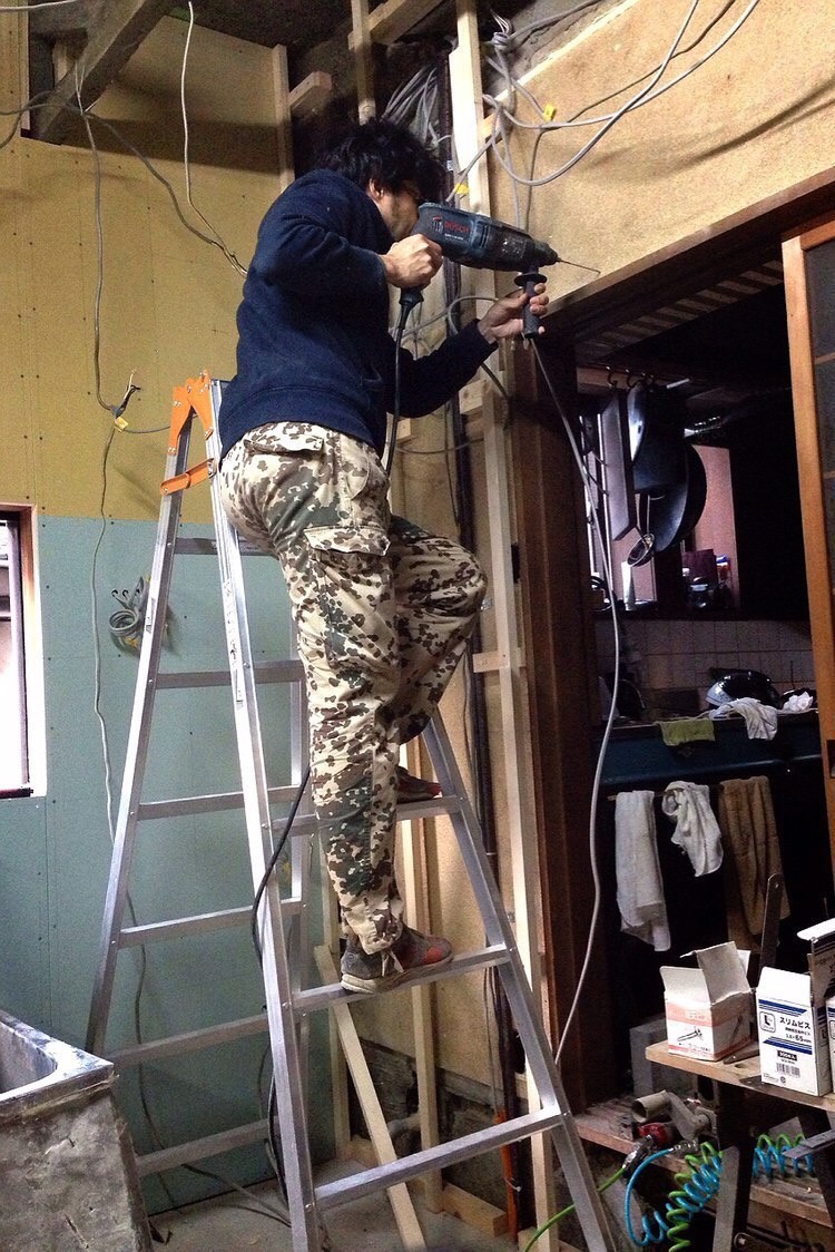 コンクリートむきだしの店内をベースに、床張りや、丸太を買ってテーブルづくりや、内装すべて、店づくりのすべてを一から、一人で作り上げた。