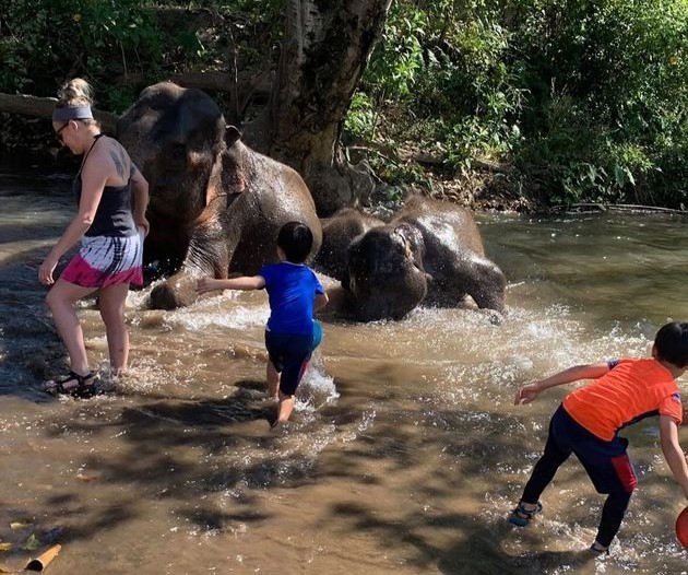 タイに移住して3年が経った今、息子たちが川でゾウと戯れる写真を眺めながら、「彼らもすっかり現地の生活に馴染みました」と目を細める。