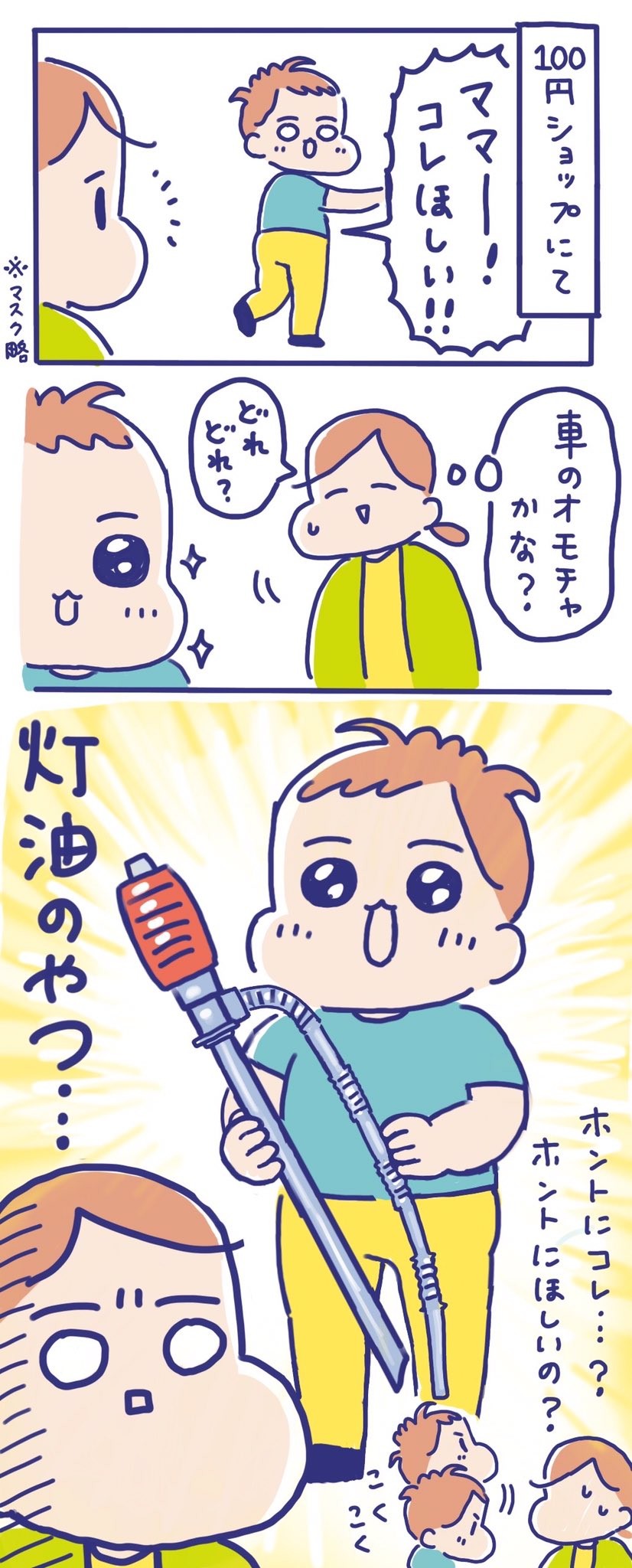 はみだしみゆきさんがちょっとした文具や裁縫道具を買いに100円ショップに立ち寄った時、息子さんが「ママ―!コレほしい!」と持ってきたものが、灯油ポンプでした。
