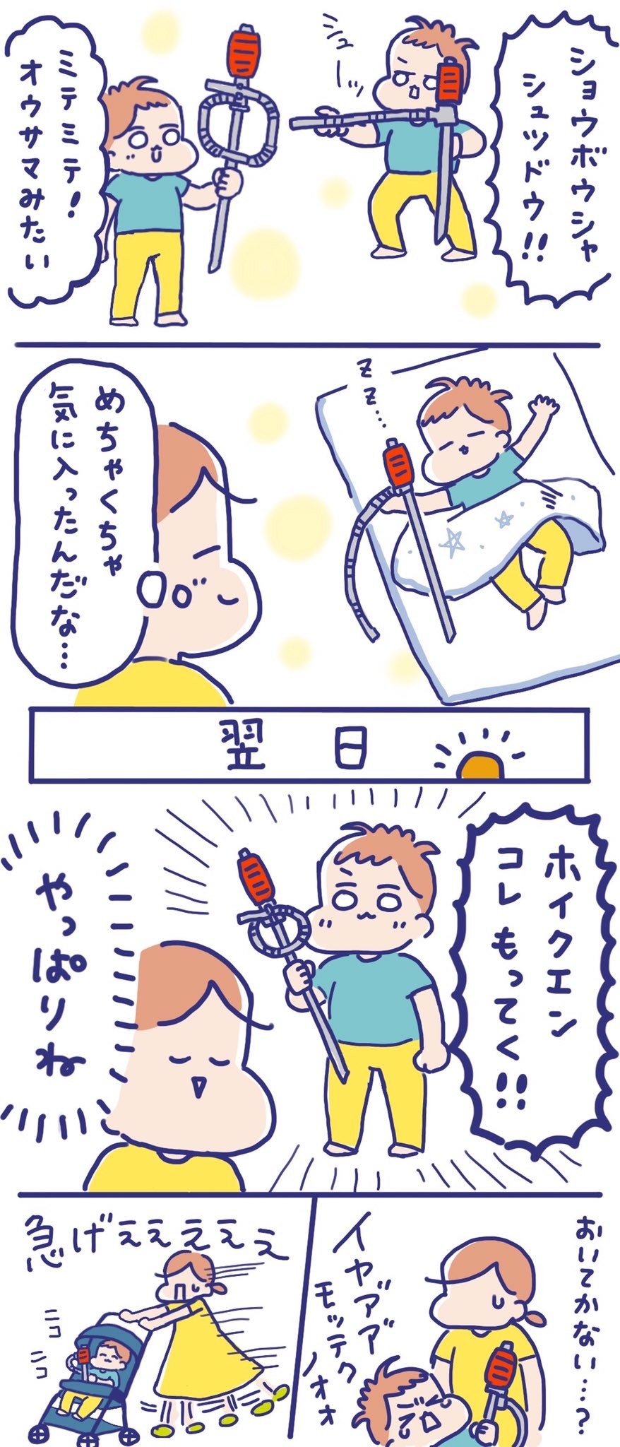 消防車ごっこが一番ハマっていたように思います。ホースを向けて「シュー!」と火を消すごっこ遊びをしていました。いつも寝るときにお気に入りのおもちゃをベッドに持っていくのですが、その日は灯油ポンプが相棒に選ばれていました。