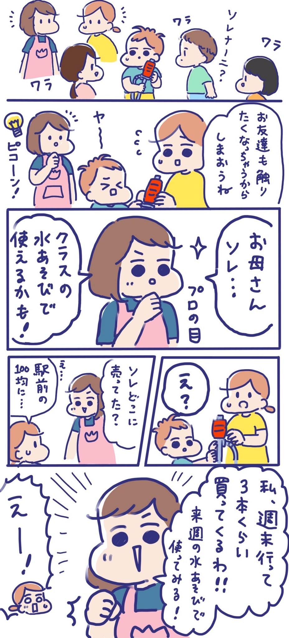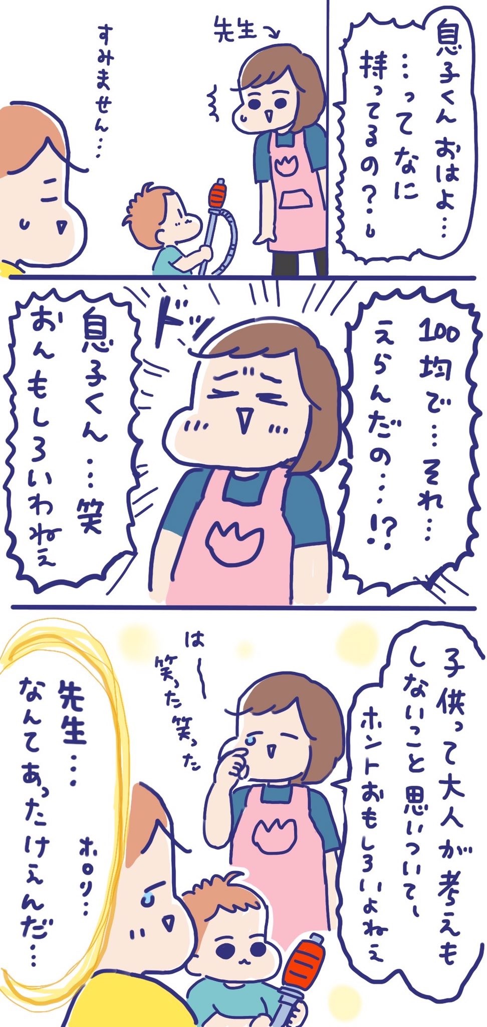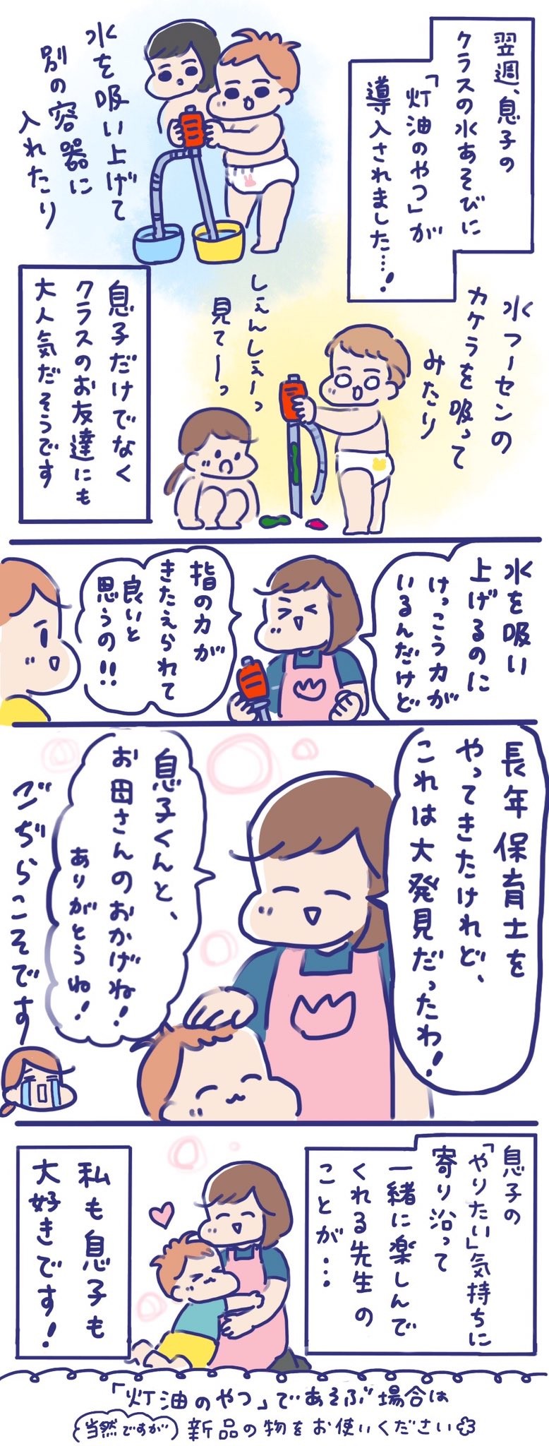 漫画では、息子さんがいつものように気に入ったおもちゃ(この日は灯油ポンプ)を保育園に持って行くと、ベテランの保育士さんが「クラスの水遊びで使えるかも」とまさかの提案をされたことが描かれています。