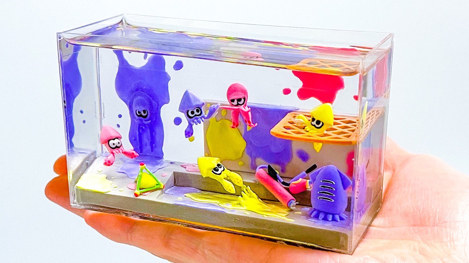 今回Twitterで反響があったのは、スプラトゥーンに登場するキャラクターが入っている水槽の作品です。スプラトゥーン3のゲームで遊んでいて、ファンアートとして何か作りたいと思ったことがきっかけだったそうです。