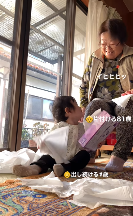 ティッシュ出し続ける1歳ひ孫→笑顔で片づける81歳 微笑ましい動画に再生数270万回超え!