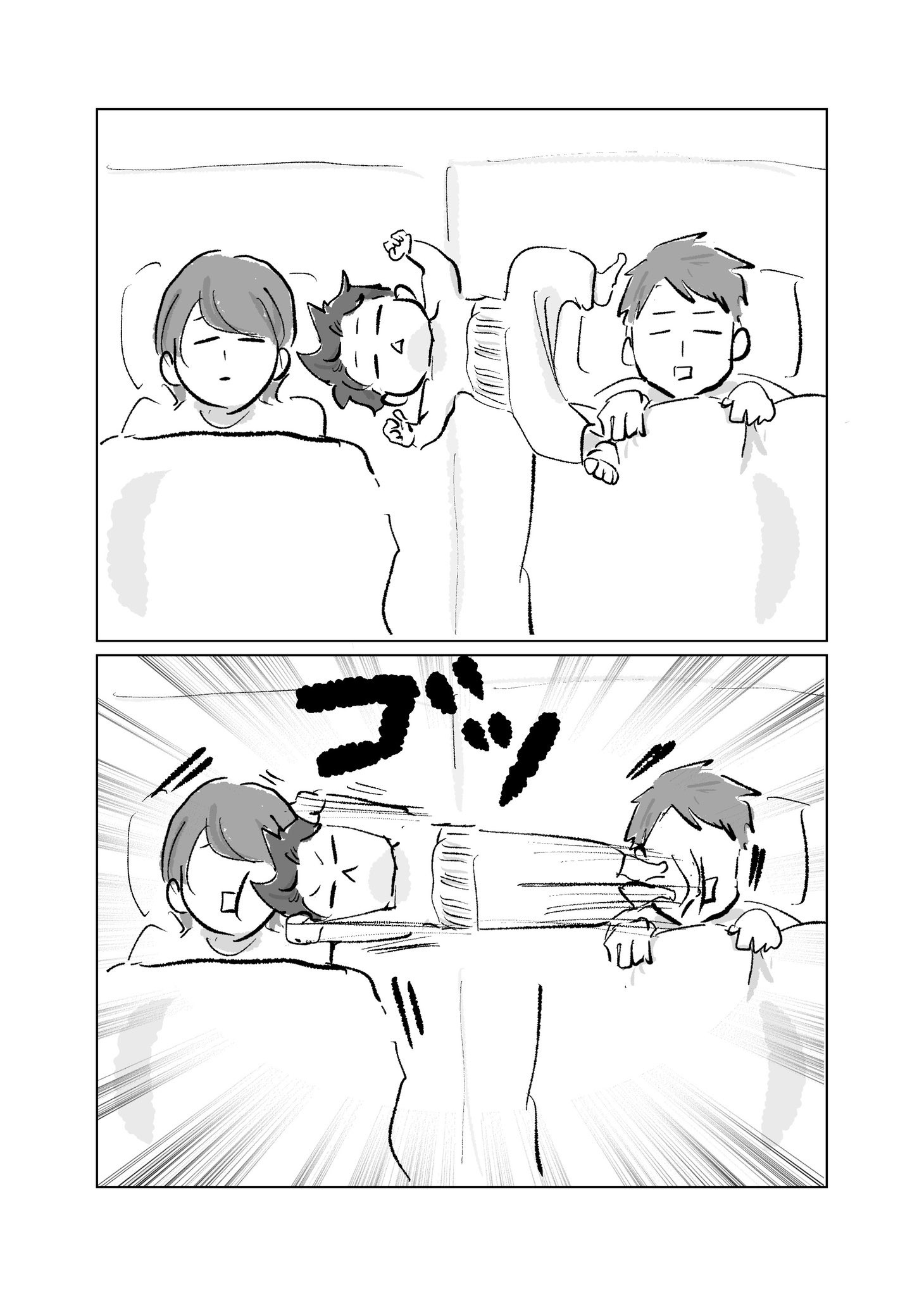 基本は川の字で寝ています。娘が布団から落ちないように(父と母で)挟んでいるのですが、気づいたら上に乗られたり蹴りが飛んできたりします。