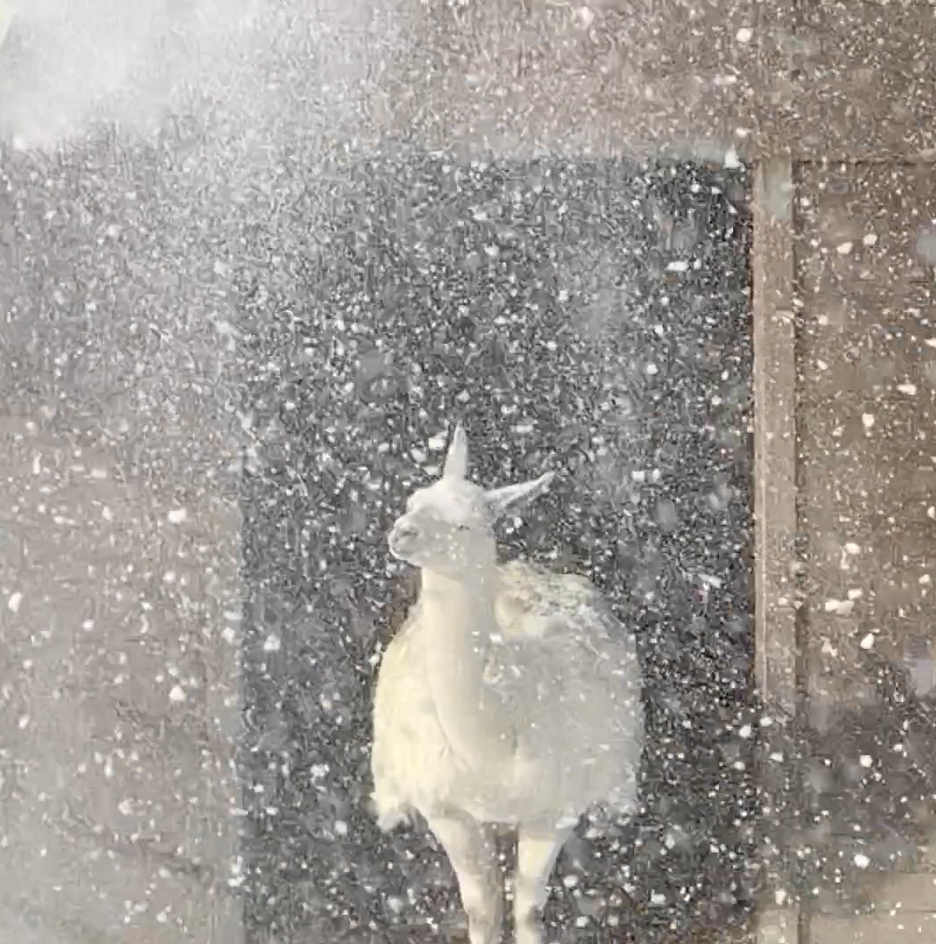 動画を見てもらうと後ろに小屋があると思うんですけど(梅ノ輔君がいる場所は)軒下なんです。なので、思いっきり雪がかぶっているわけではないです。カメラとラマの間に雪が落ちてきたので、気にしていない表情をしていたかな。と思っています。ラマは、寒さには強い動物です。ただ、雪や風が強いときは小屋に避難しています。