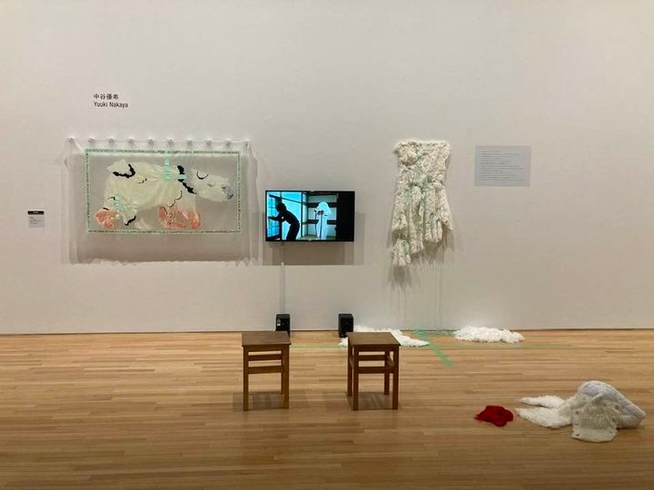 切り刻まれたシロクマの毛皮が壁面に貼り付けられ、モニターから不思議な映像が流れる。登場人物は、シロクマの被り物をした中谷さん。呪文のような言葉を唱えながら、室内を行ったり来たり。ミモカアイで準大賞に選ばれた「シロクマの修復師」は、絵画と54分の長編映像を組み合わせた作品だ。