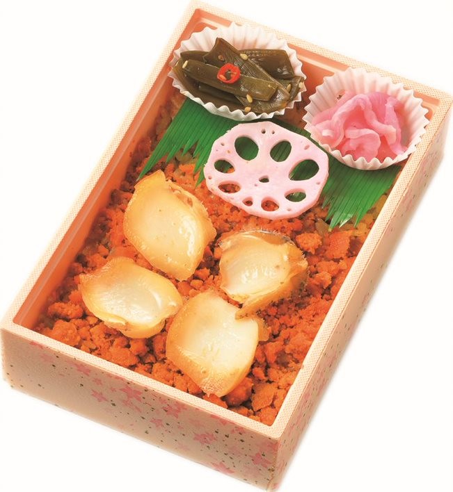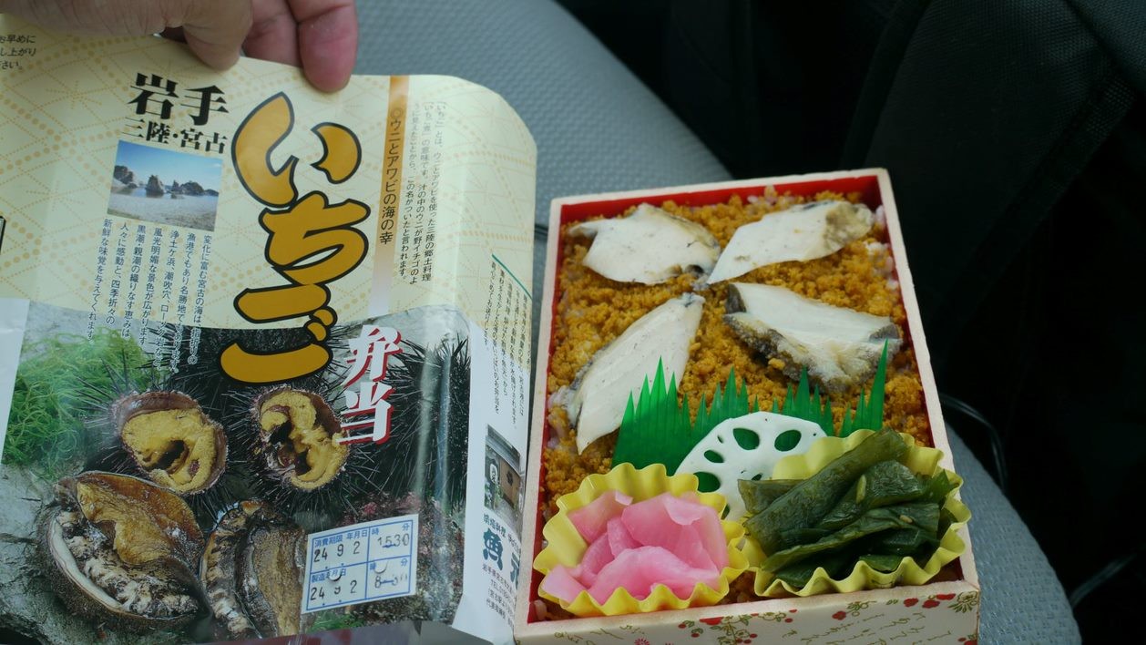 この「いちご弁当」は、ウニ・アワビを煮た三陸地方の郷土料理「いちご煮」(煮たウニが野いちごに見えることが名前の由来)をイメージしたもので、米の上はスライスしたアワビと柔らかい蒸しウニで覆われ、味はもちろんのこと、見た目も鮮やかな逸品。