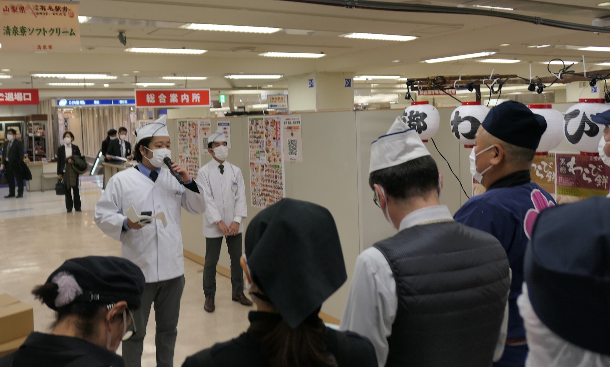 開店45分前に行われる朝礼では、伝達事項を業者に伝える横山マネージャーもやや緊張した面持ち。一方で各ブースでは仕込みや調理作業が着々と進み、数人の担当社員が仕込みの進捗具合をこまめにチェックしている様子です。