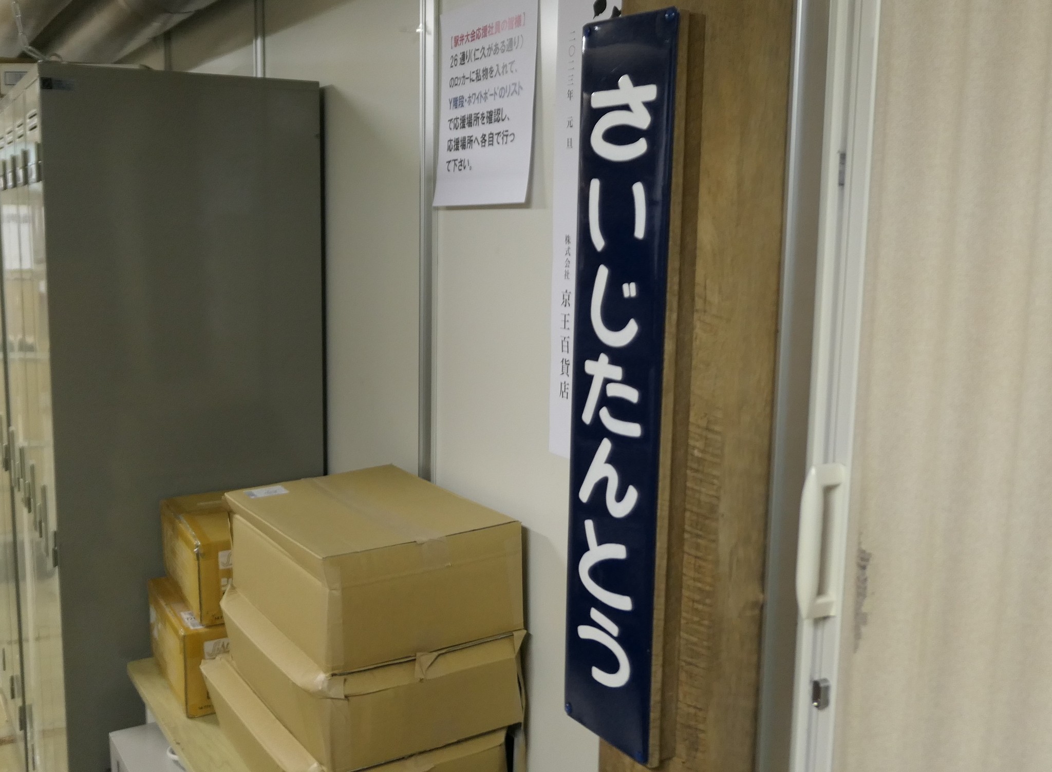 駅弁大会などの催事運営を担当する部署の事務室には、駅名標を模した「さいじたんとう」(催事担当)の看板がかかり、鉄道会社(京王電鉄)を親会社にもつ百貨店ならではの、鉄道イベント・駅弁大会へのこだわりを窺わせます。