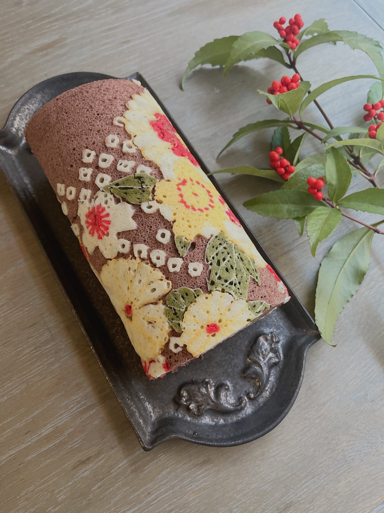 「基本的には他の一般的なデコロールケーキと一緒で、パータデコール(装飾用の生地)で着物柄を描き、その後ロールケーキ生地を流して焼き上げました」
