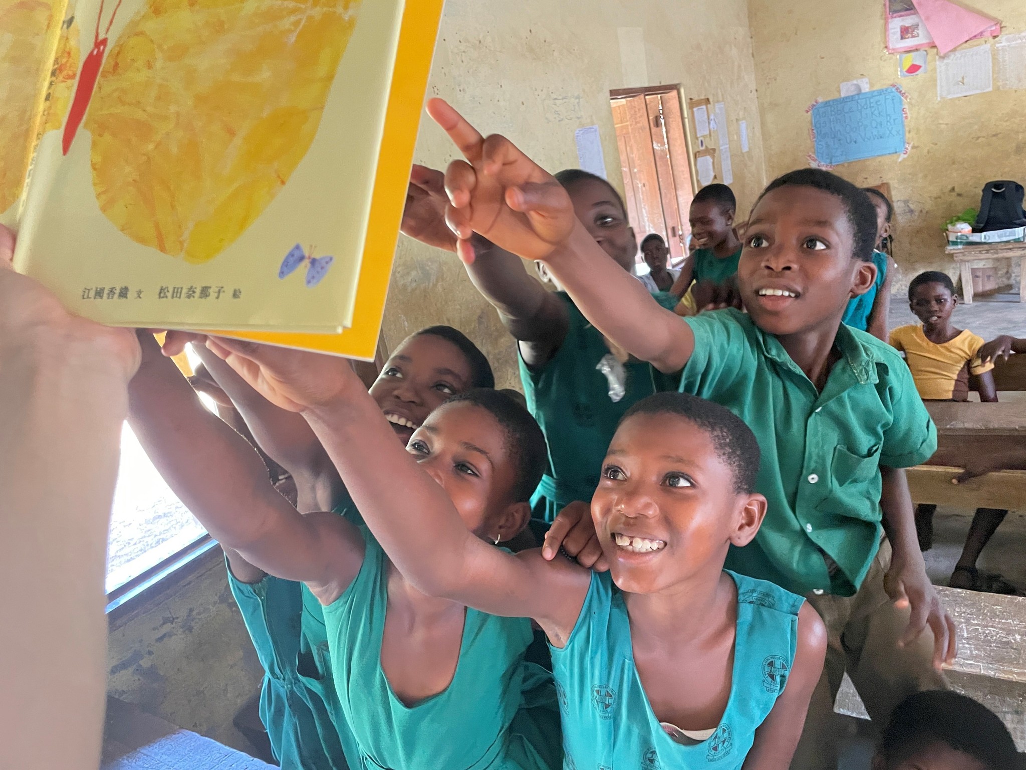 2~3年生が描いたモチーフが「ちょうちょ」だったことにはこんな理由がある。約20年前、高知県出身の駐ガーナ大使がいた時代に、「ガーナよさこい祭り」という祭りがはじまった。この祭りで、日本にルーツをもつ現地在住の子どもたちに日本語を教えている学校の人たちが、日本語の絵本をたくさん販売していた。そこで購入した絵本を、学校の全クラスでの読み聞かせに使うこととなった。それが「ちょうちょ」という絵本だった。
