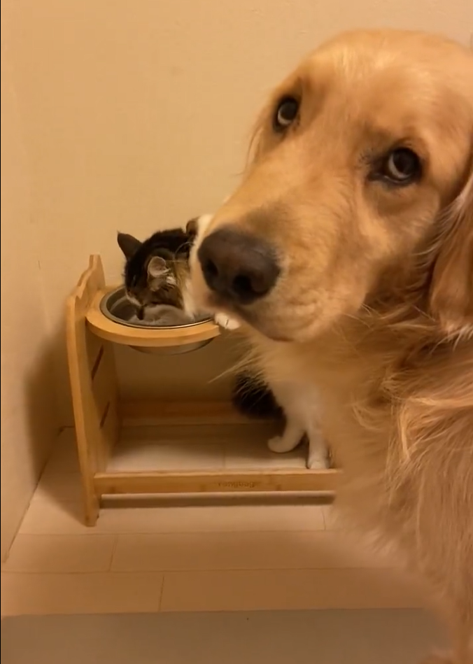 独特な水の飲み方をする猫のさんちゃん。さんちゃんが飲んでいる水は実は犬のまるくんの水だったようで…