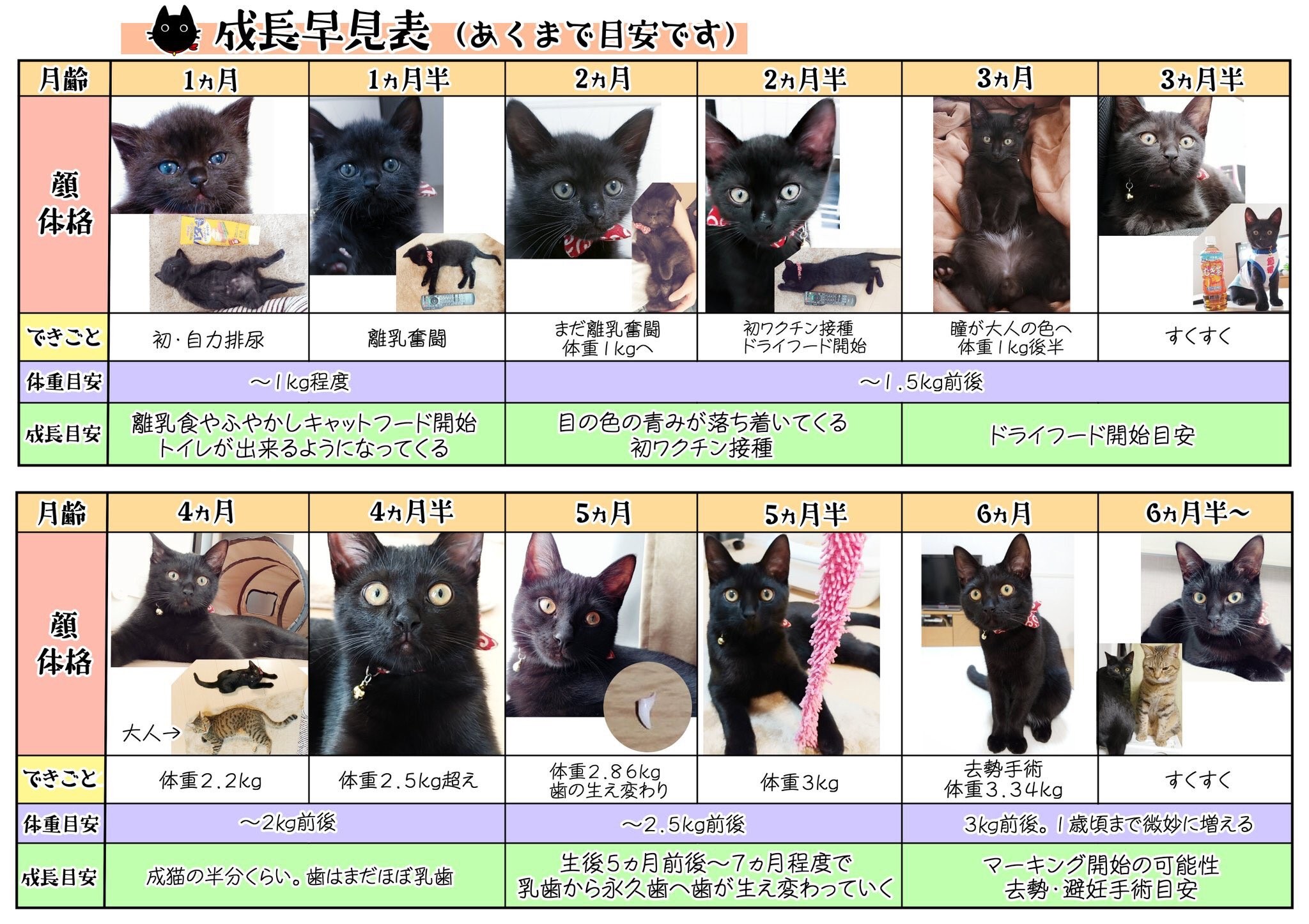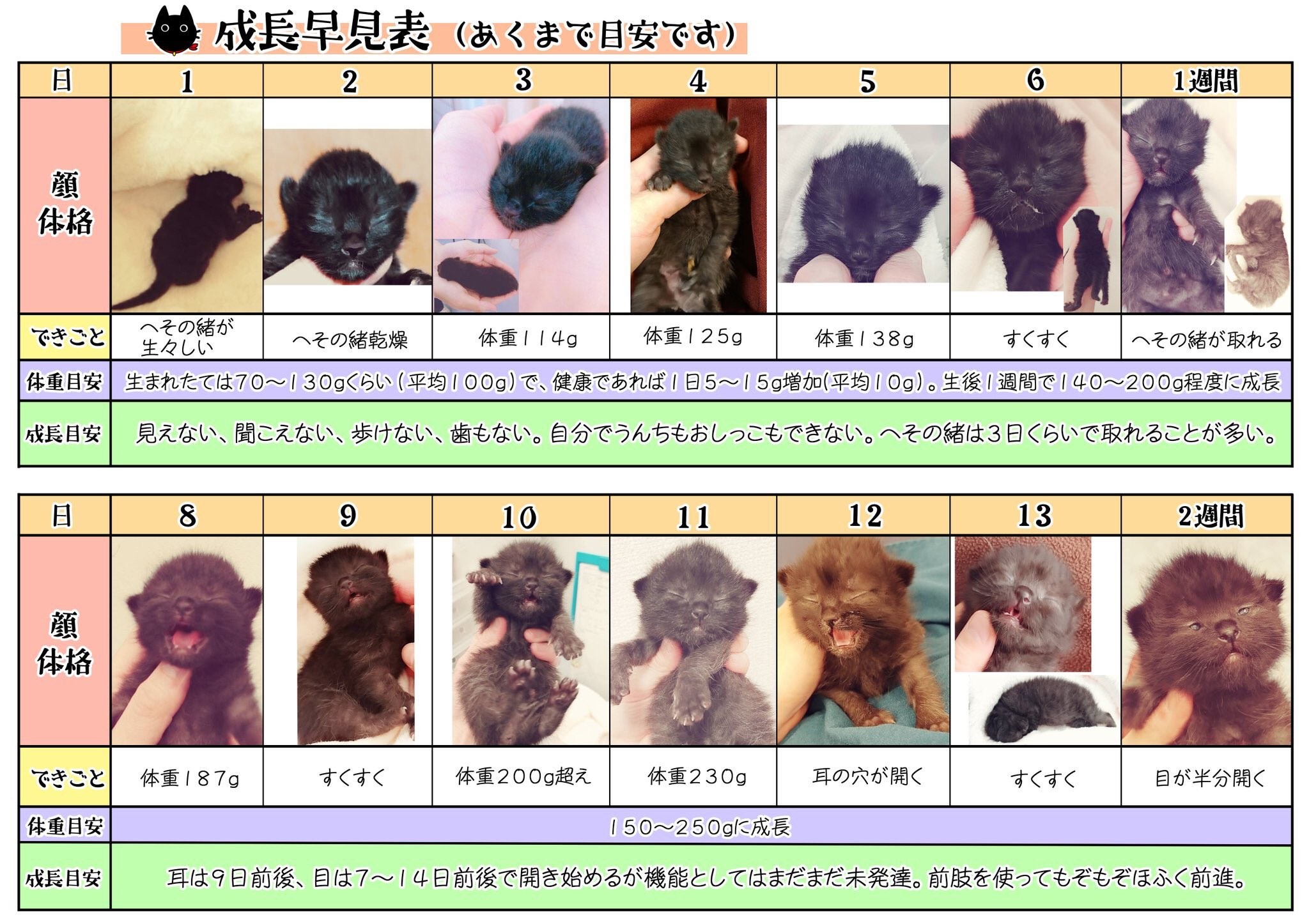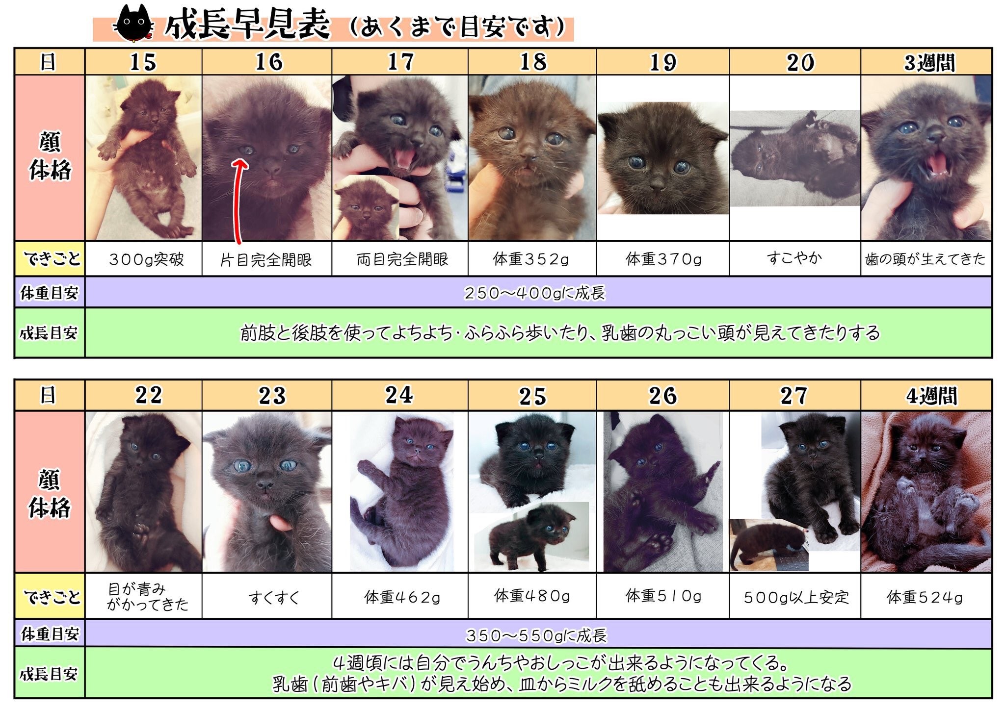 短い文章に写真がつけられるので記録をつける上で丁度良く、公開することで誰かの参考になれば良いなとも思いました。また途中から個人的に仔猫の成長目安の一覧表を作りたくなったので、正面からの顔写真と全体の写真は撮影するようにして記録をしていました。