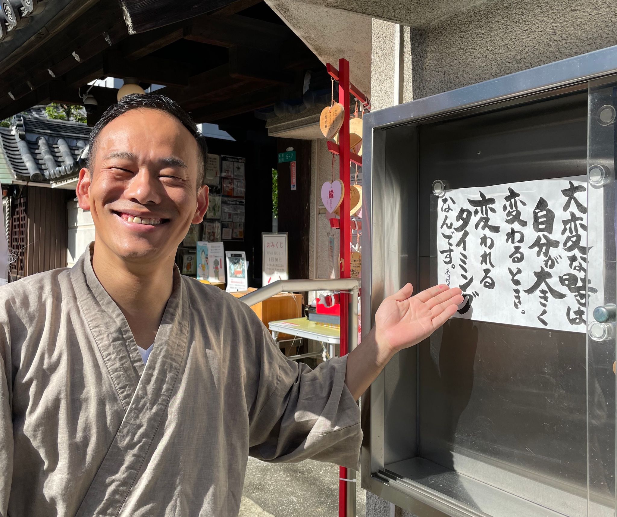 藪本さんは午前7時ごろ、寺の前の掲示板に「ひとこと」を張り出す。25代住職になった2006年ごろ、20代の感性を生かして始めた。実際に筆を持って、半紙にしたためる。インスタグラムなど数種類のSNSでも同じ言葉を発信しており、多くのコメントが寄せられている。