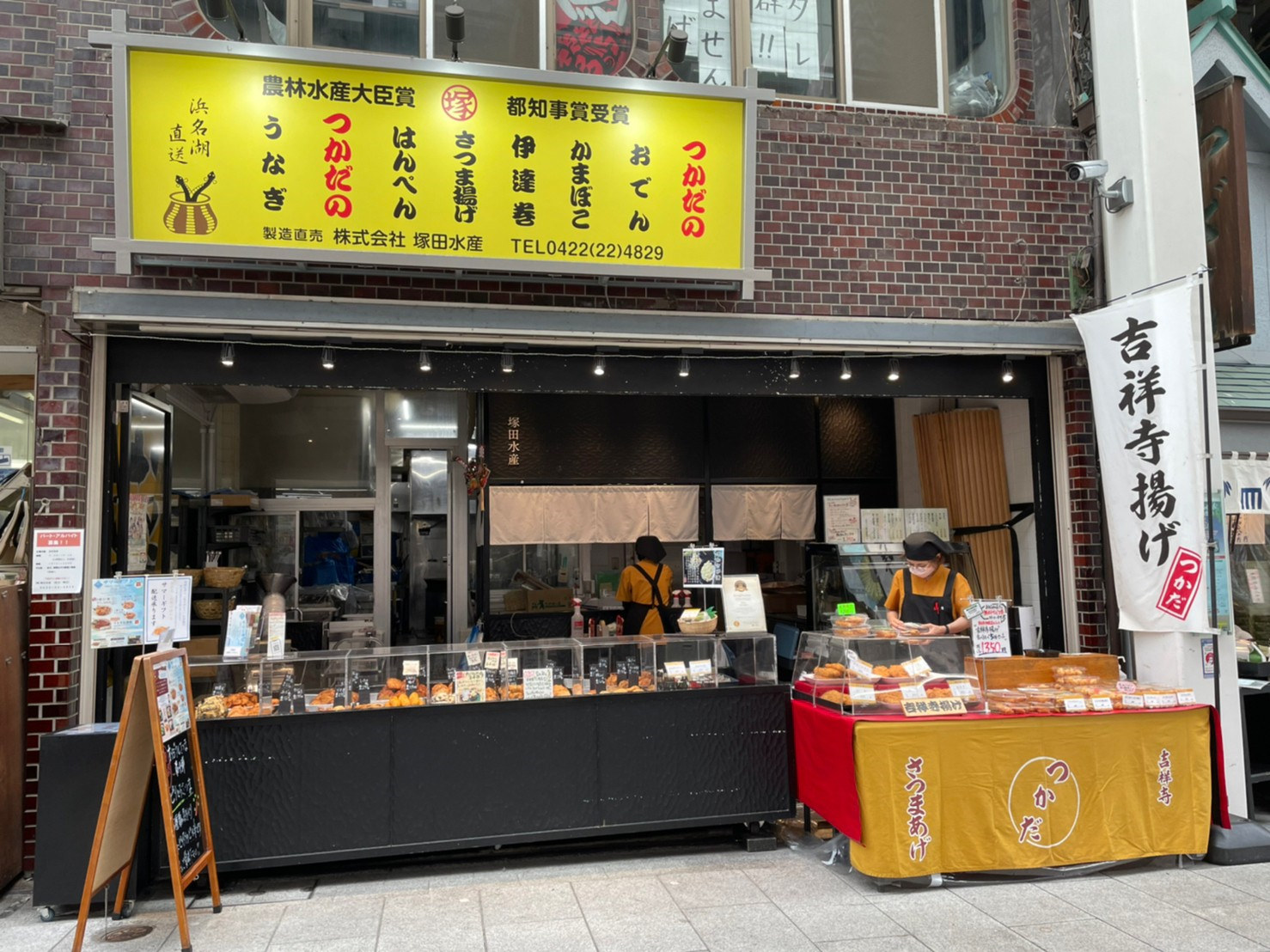 JR吉祥寺駅から徒歩2分程度、商店街「ダイヤ街」の老舗が並ぶ一角にある「塚田水産」です。