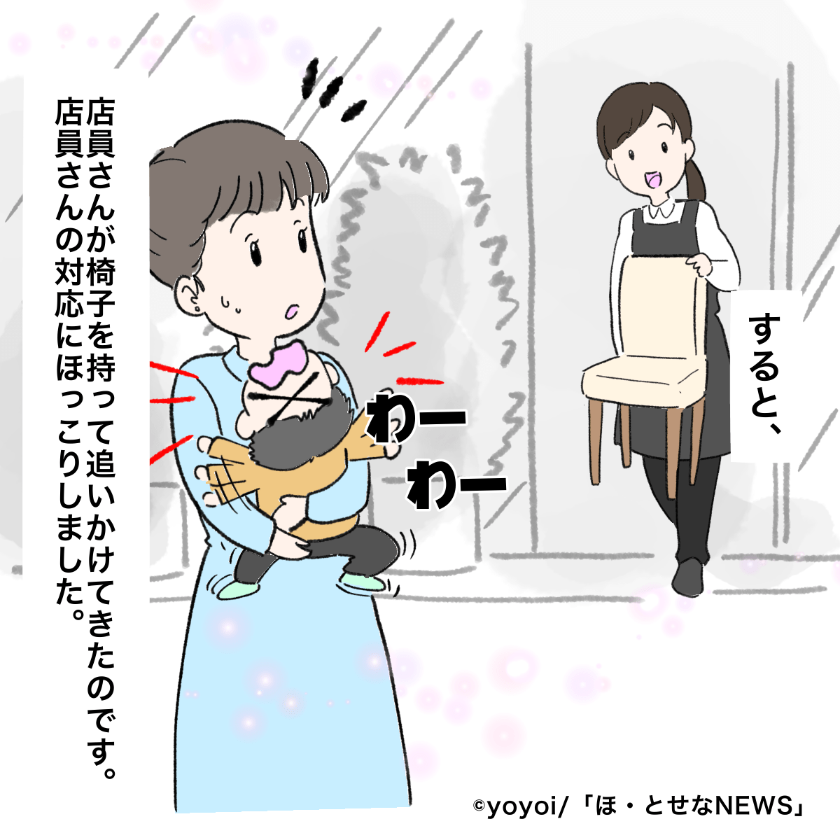 この店員さんはAさんが泣いている子どもを連れてお店の外に出て行った姿を見ていたのでしょうか。店員さんの温かい対応にほっこりしますね。