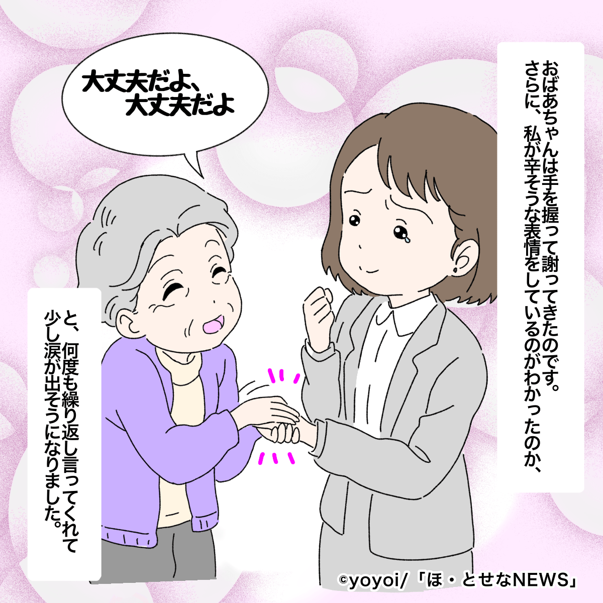 このことについてAさんは、「気にされる方もいるかもしれないのですが、当時仕事の人間関係がきつくて心が疲れていた私には、すごくほっこりした瞬間でした。おばあちゃんの手が、すごく柔らかかったんです」といいます。