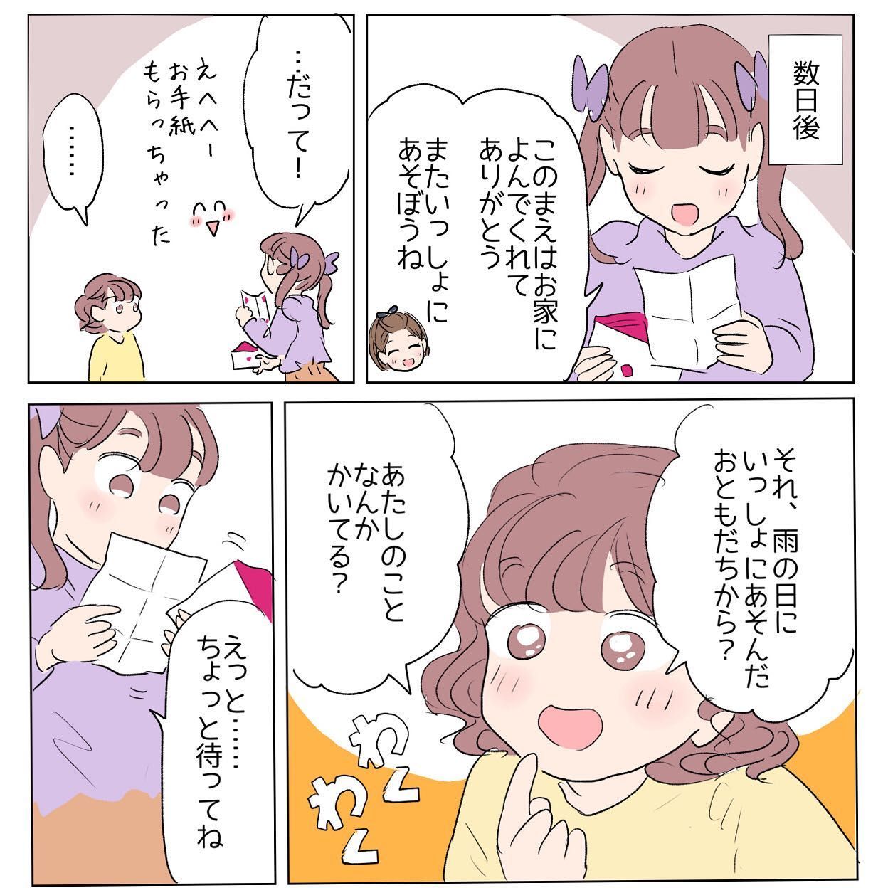 数日後、そのクラスメイトから長女ちゃん宛にお礼の手紙が届きます。長女ちゃんが手紙の内容を読み上げると、次女ちゃんが「あたしのことなんかかいてる?」と聞いてきました。