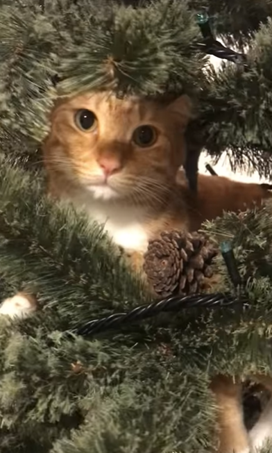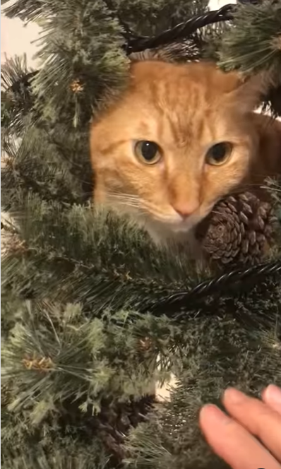 ツリーに登ってみたいという衝動を抑えきれなかったもんちゃん。ツリーに登ってしまうのは猫ちゃんあるあるのようですが、ツリーの中に猫ちゃんがいたらサンタさんも驚いてしまいますね。
