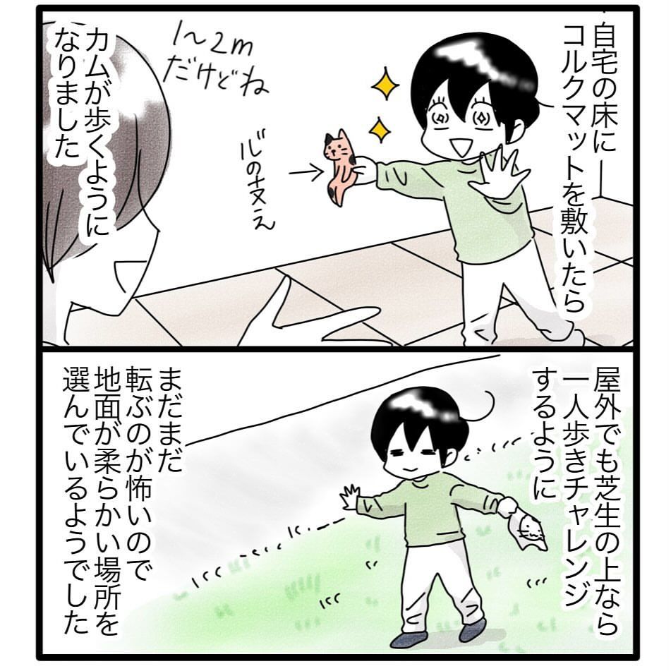 その後は、またひとりではなかなか歩こうとしなかったカムくんですが、柔らかい床にしたところ、歩くようになったそうです。