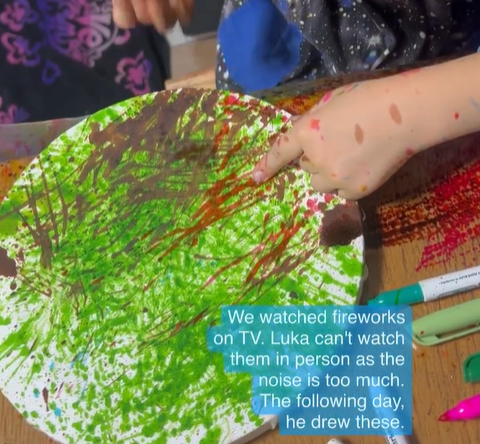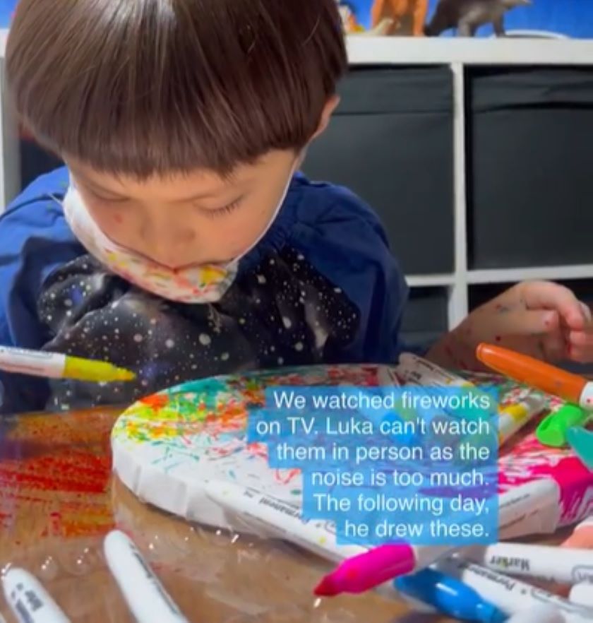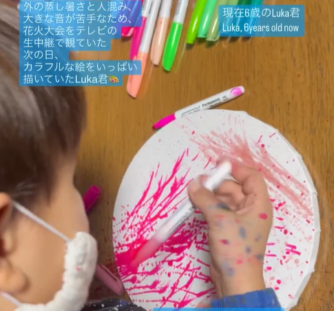 ルカくんは花火のような絵を描きます。ルカくんが年長さんのときにも、同じクラスメイトのお友達が「ルカくんの絵、大好き!ルカくんの絵、花火みたいで綺麗!」と言いにきたこともあったそうです。