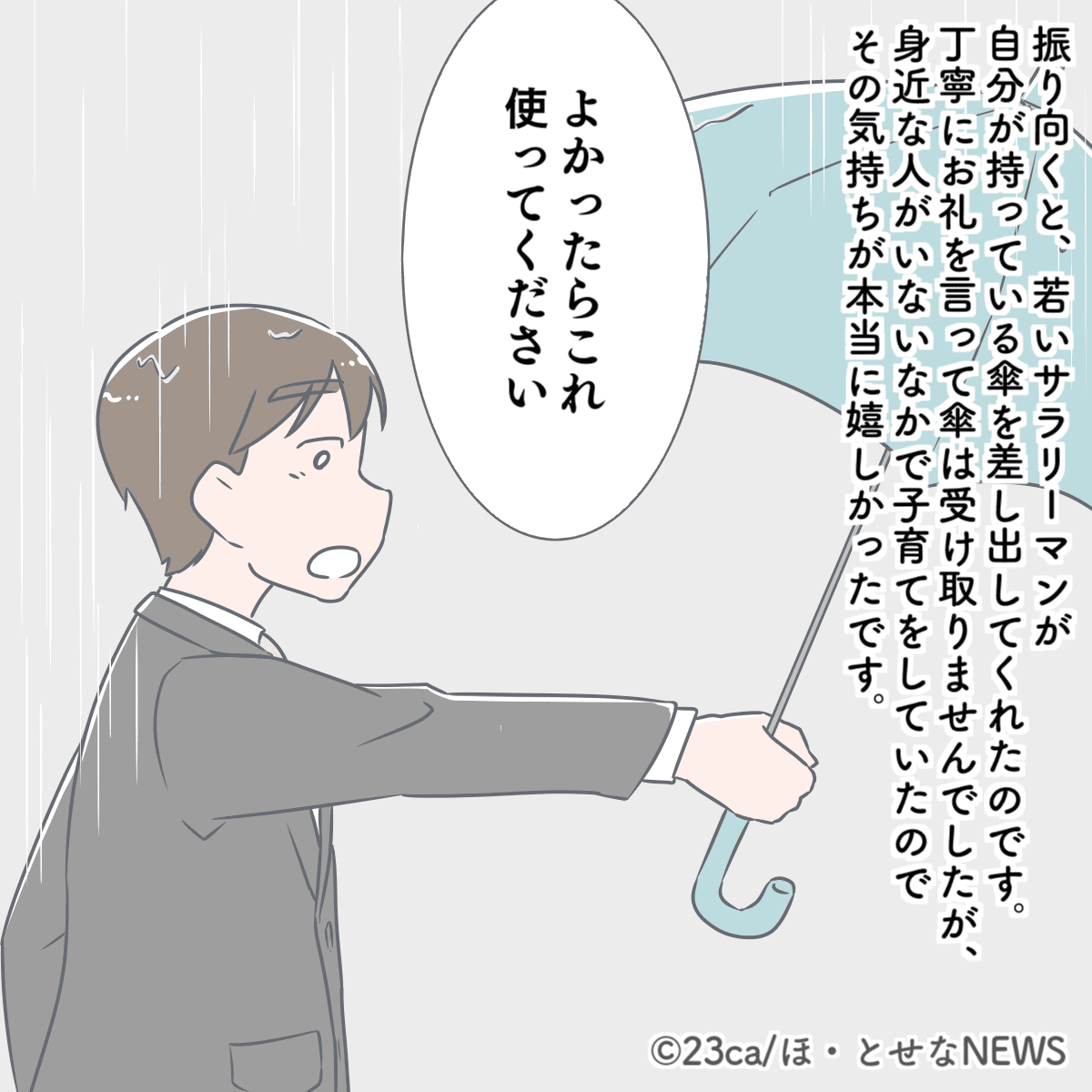 しかし、地方から出てきて知らない土地で、友達や知り合いがいない中のワンオペ育児だったアミさんは、傘を差しだしてくれたその気持ちを本当に嬉しく思ったといいます。