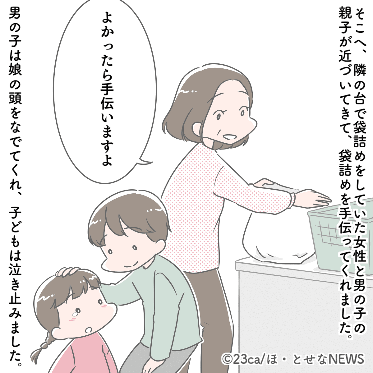 ただでさえワンオペ育児で疲弊していたところに、周囲へ迷惑をかけてしまう申し訳なさが加わり、レイコさんも泣きそうなほどでした。するとそこへ、隣の台で袋詰めをしていた50代くらいの女性と小学校中学年くらいの男の子の親子が近づいてきました。そして、女性が「よかったら手伝いますよ」と、サッと袋詰めを始めてくれ、男の子はマミちゃんの頭をなでてくれました。