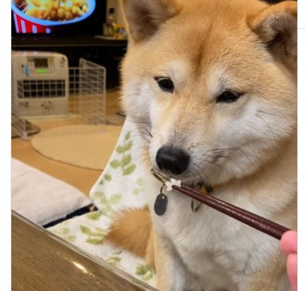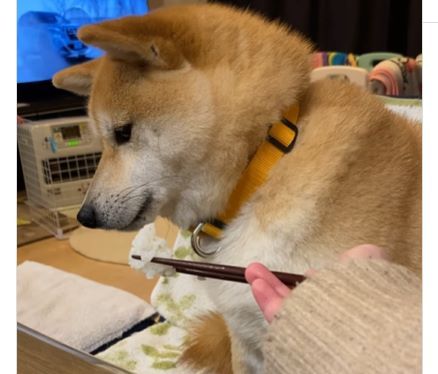 ご飯粒をもらっているのはこむぎちゃん。いつもはお皿にのせて食べていますが、この日はお箸でご飯をあげようとした@komugi_0612さん。