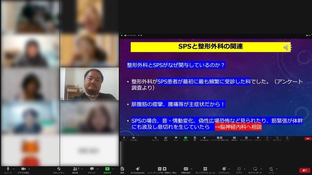 SPSが起こす症状は個人差がありますが、多くは筋肉の硬直、こむら返りの症候群症状が全身に起こります。軽い攣(つ)りは身体を動かしたら常に大なり小なりはあるといいます。また音光によって攣りなどを誘発されます。