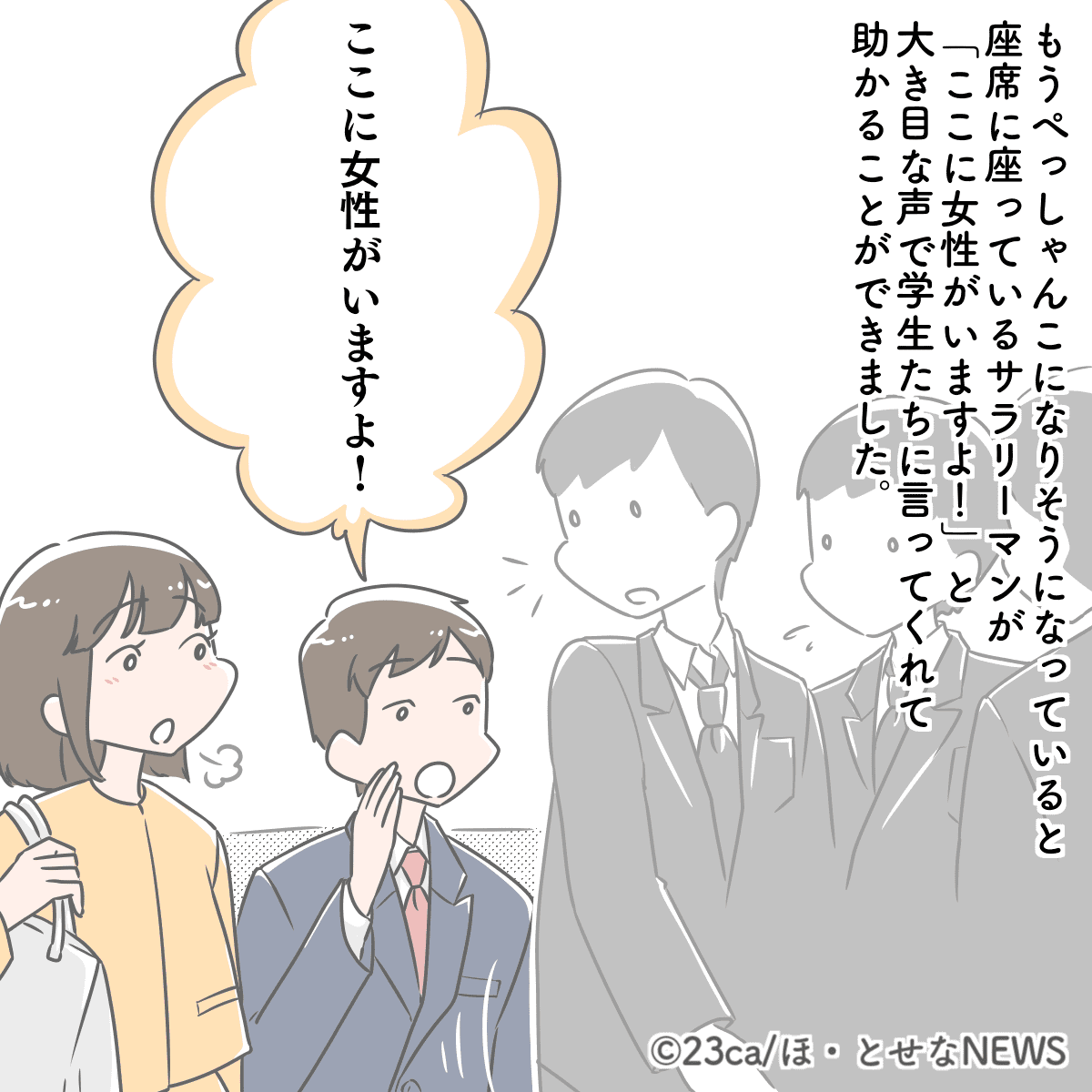 すると、座席に座っているサラリーマンが「ここに女性がいますよ!」と大きな声で学生たちに言ってくれたのです。押しつぶされそうになっていたリョウコさんは、何とか助かったのでした。