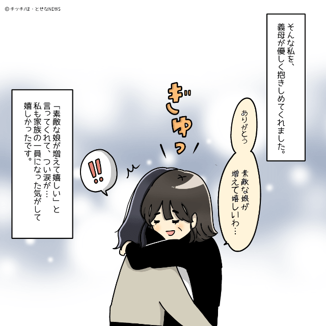 その言葉につい泣いてしまったりなさん。それからお義母さんは「あまり気をつかわずに話してね」と言い、りなさんは家族の一員になれた気がして嬉しくなりました。