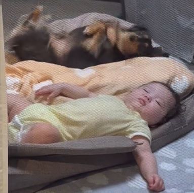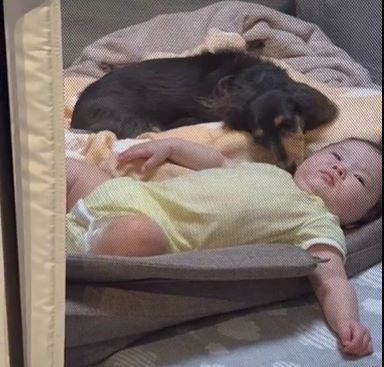 普段は安全上の観点から、お子さんとは一緒に寝ていないそうですが、@kou111dachsさんの目が届くお昼寝のときにだけ、近くにいるというこうちゃん。
