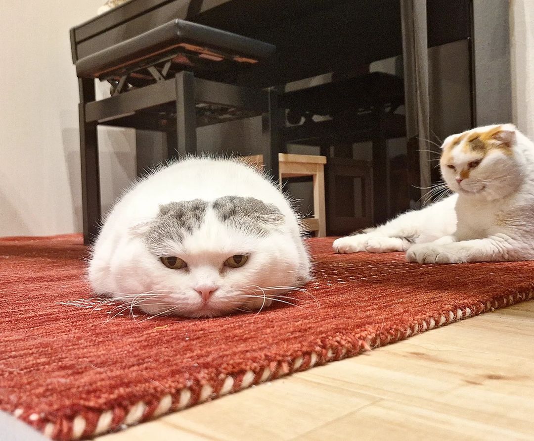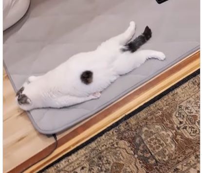 ライくんは、よく床で伸びてくつろいでいる様子。ojarinnさんの家に来て半年ほどすると、このように伸びた体勢でくつろぐようになったのだとか。かなりリラックスしているときに伸びているそうですよ。