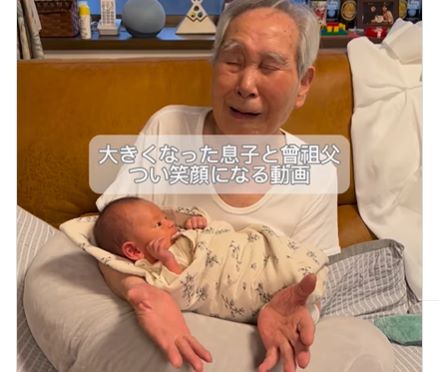 今では抱っこもできるようになった曾祖父さんですが、息子さんもじっとしてないので、曾祖父さんが遊ばれているような感じなのだそうです。そんな2人の可愛らしい様子に、家族は笑いながら見守っているのだとか。90歳差の2人が遊んでいる様子は癒されますね。